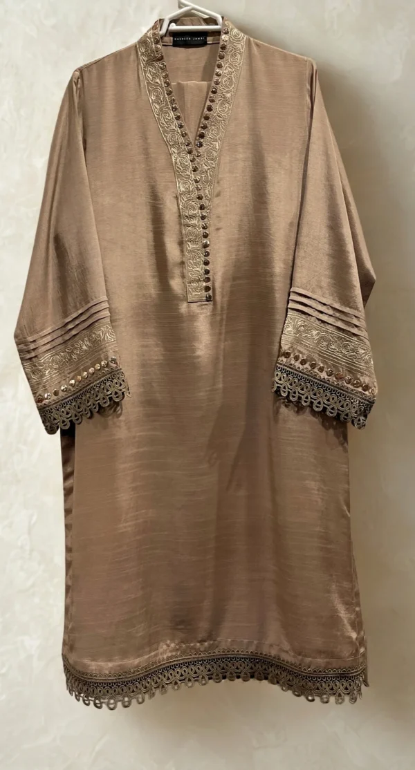 The season's favourite Chocolate brown short shirt is adorned with tilla embroidery with handworked zardozi work on the sleeve hem. Handmade, same fabric buttons beautify the front.