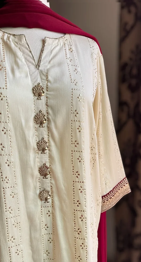 Eid calls for Ivory shade outfits, with mukesh work that looks like none other. This look is elevated with gold buttons that match impeccably. An embroidered border around the sleeve that completes the look in a contrasting maroon. Paired with regular fit trouser. Contrast the Dupatta to complement the finished
