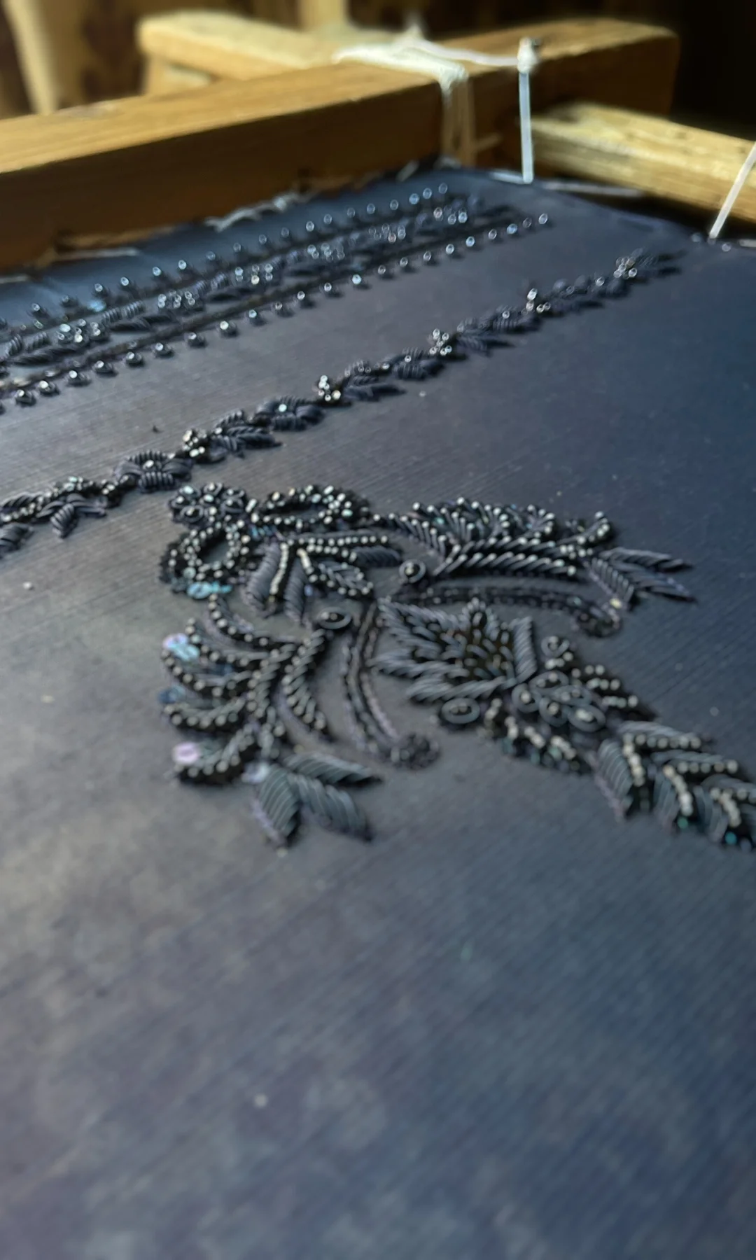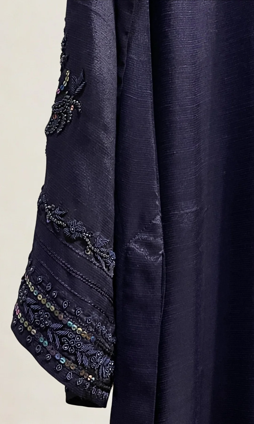 A regular-fit, raw silk shirt with intricate hand-embroidered zardozi work in the sleeves and a sequined neckline.
