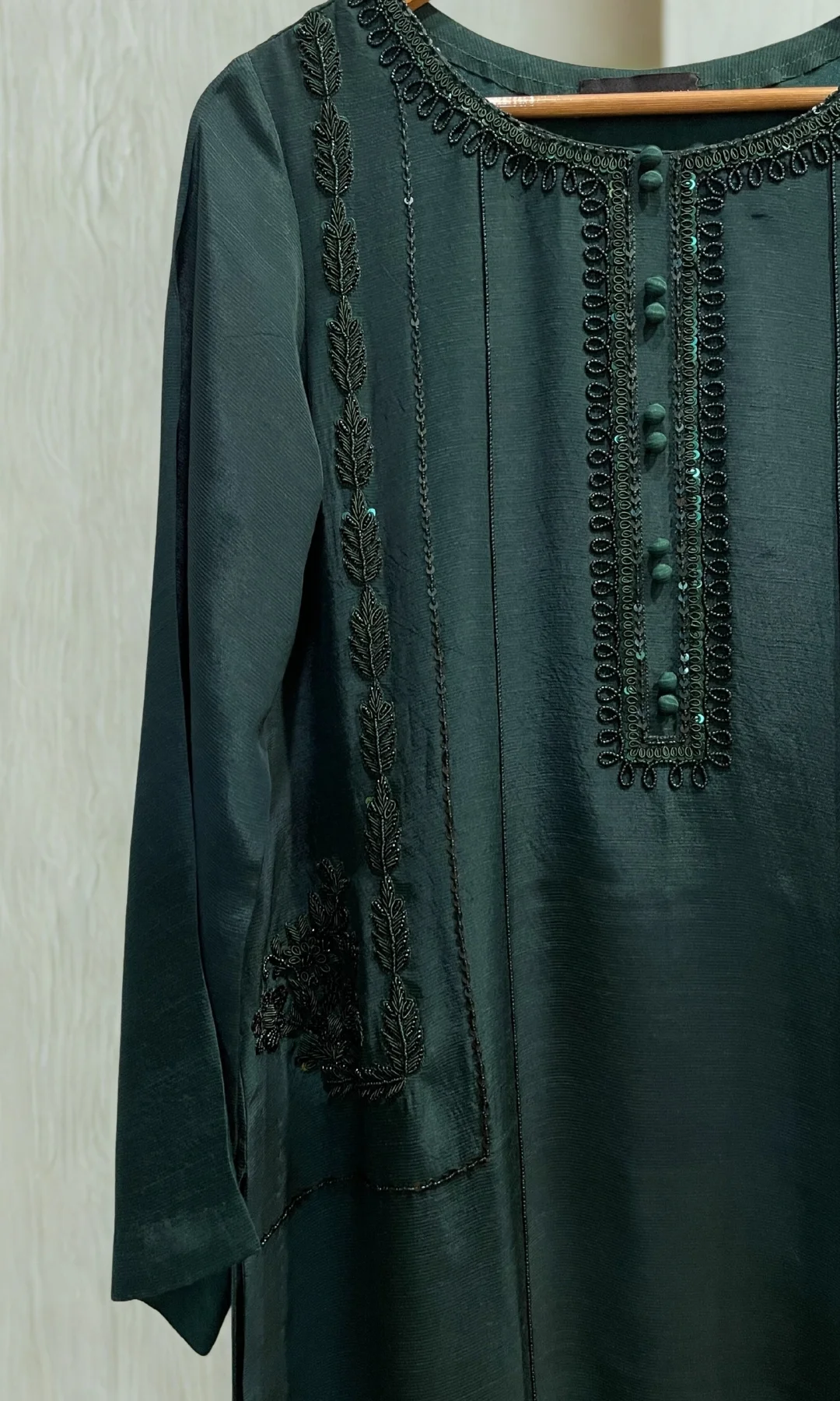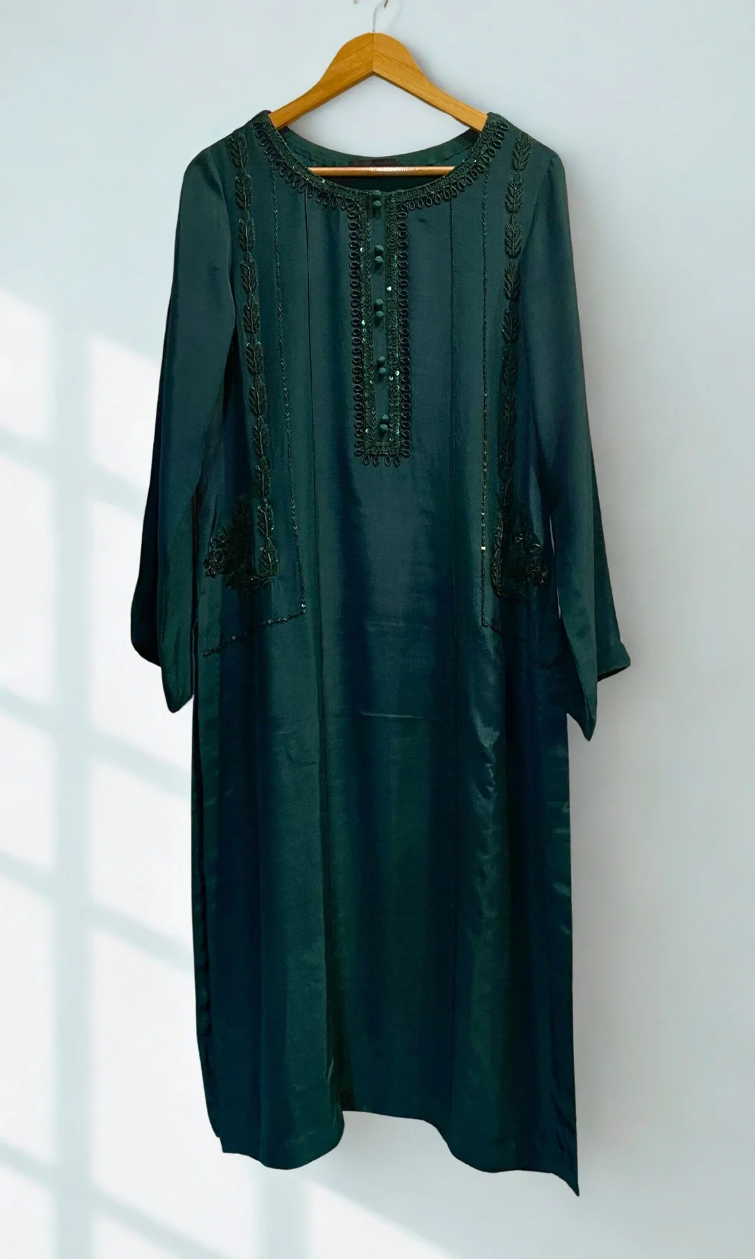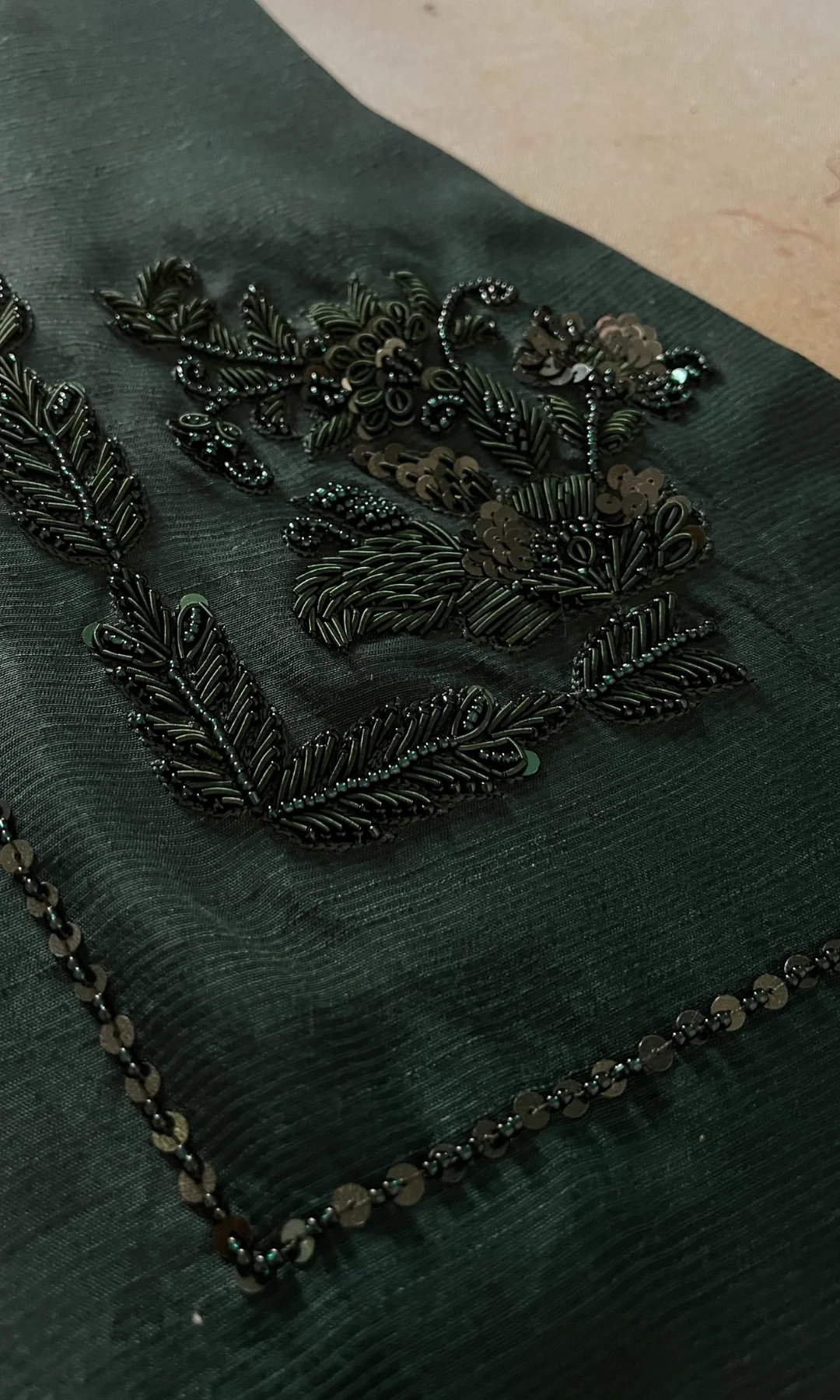 Perfectly designed to celebrate all your special occasions, this emerald green ensemble is made to perfection with zardozi work in kora, dabka, nakshi, and sequin intricate work on the entire front. Paired with flared Raw silk trouser. Dupatta finished with facing on pallu sides and lace on both long lengths