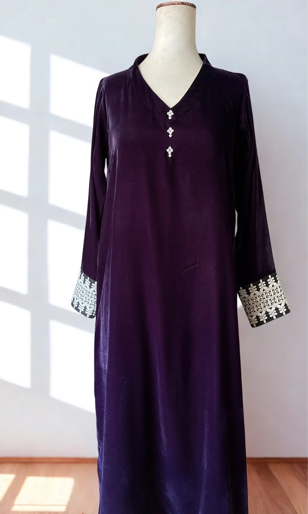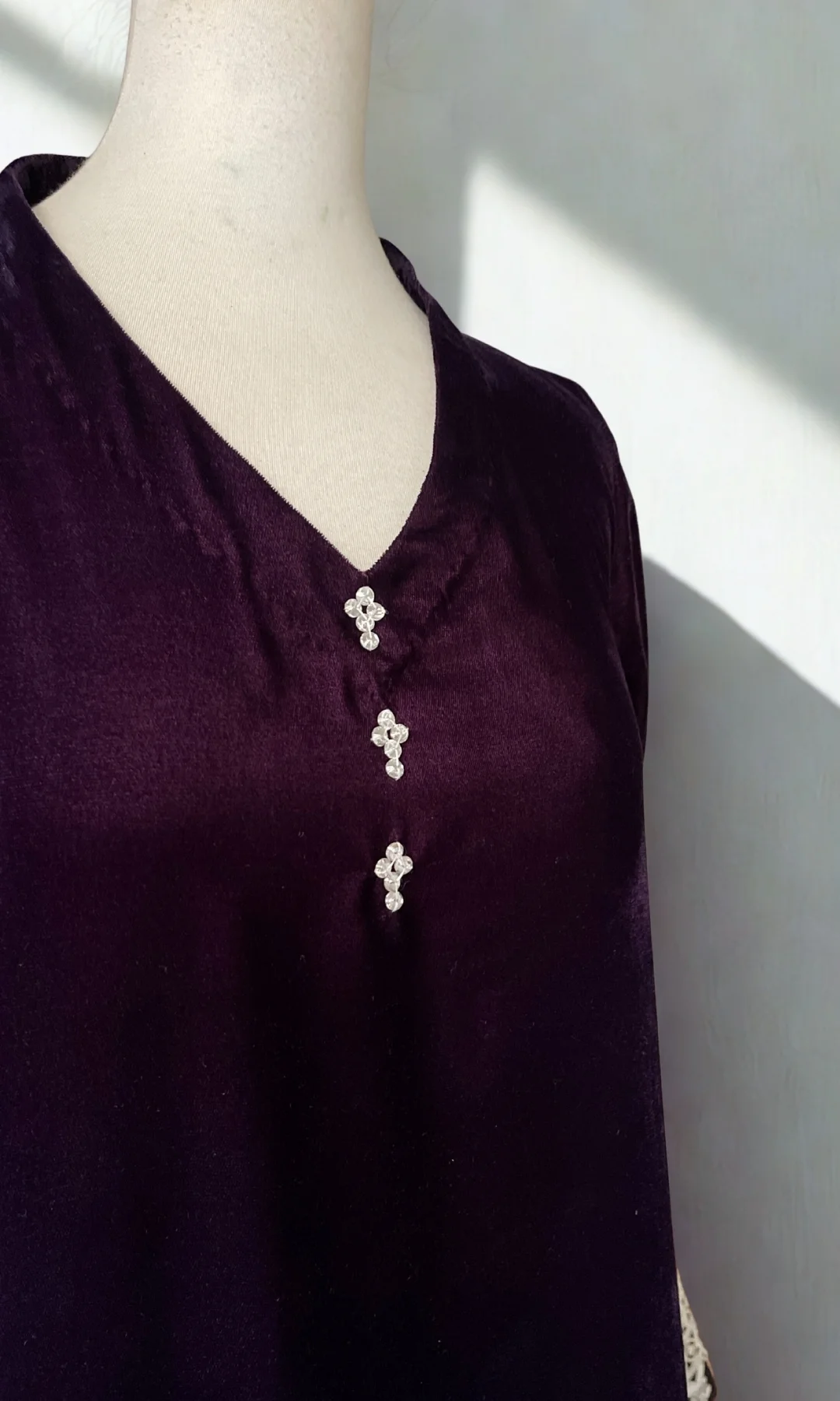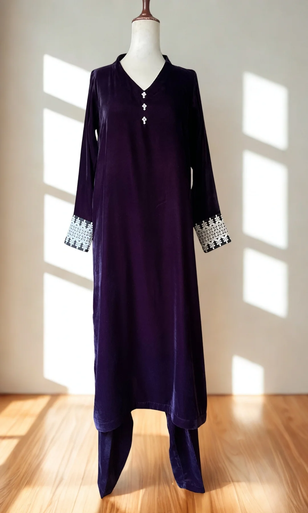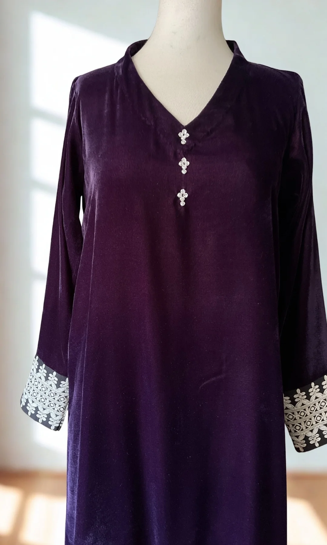 This plum pure Velvet ensemble beautifully blends style with elegance. Delicate embroidery done around the sleeve ends with handmade buttons in the front with diamontees and a A line look gives it a refined silhouette. Paired with regular Velvet Trouser. Dupatta finished with the facing on the pallu sides.