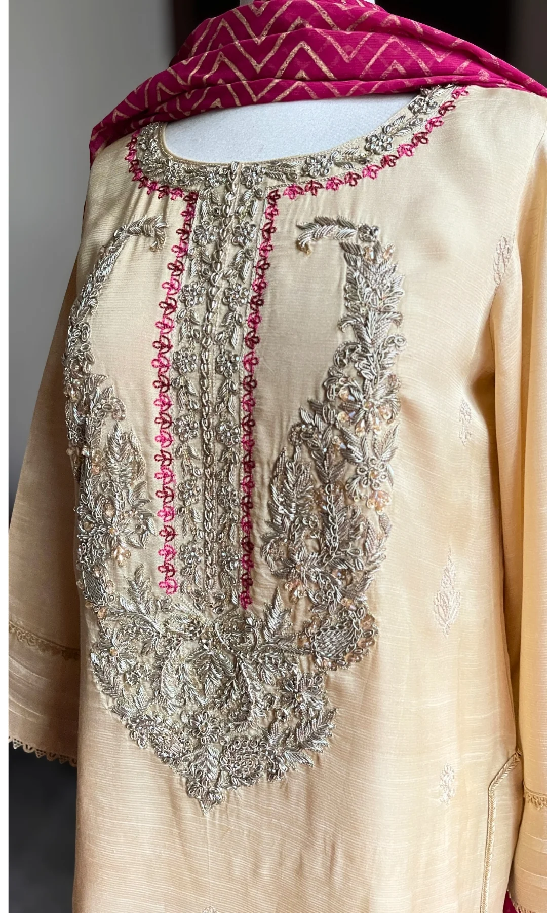 Perfection lies in the hand-worked embellished heavy neckline with zardozi work that includes kora, nakshi sequin and bead work.The sleeve looks sleek with the perfect detailing of pleats and lace. Paired well with the trendy farshi shalwar. Gold printed dupatta that goes perfect.