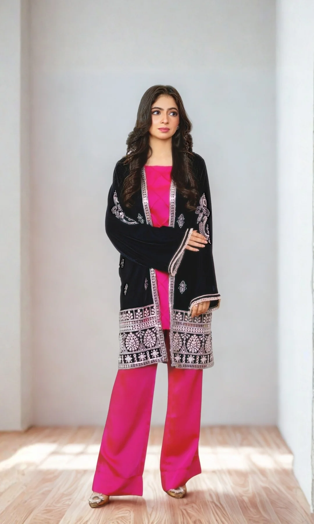 This gorgeous hot pink attire can be worn as a classic two-piece or with the coat to give it a luxe feel. The shirt is stitched to perfection with pintuck detailing, paired with smartly draped boot-cut trousers. The heavily embellished velvet coat is a showstopper.