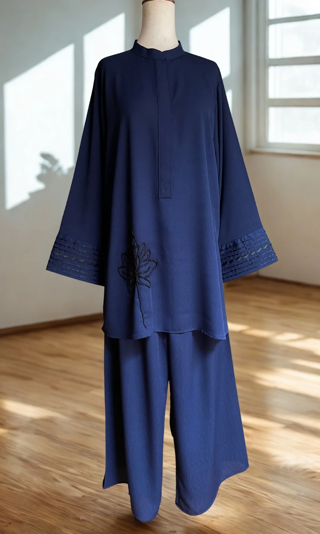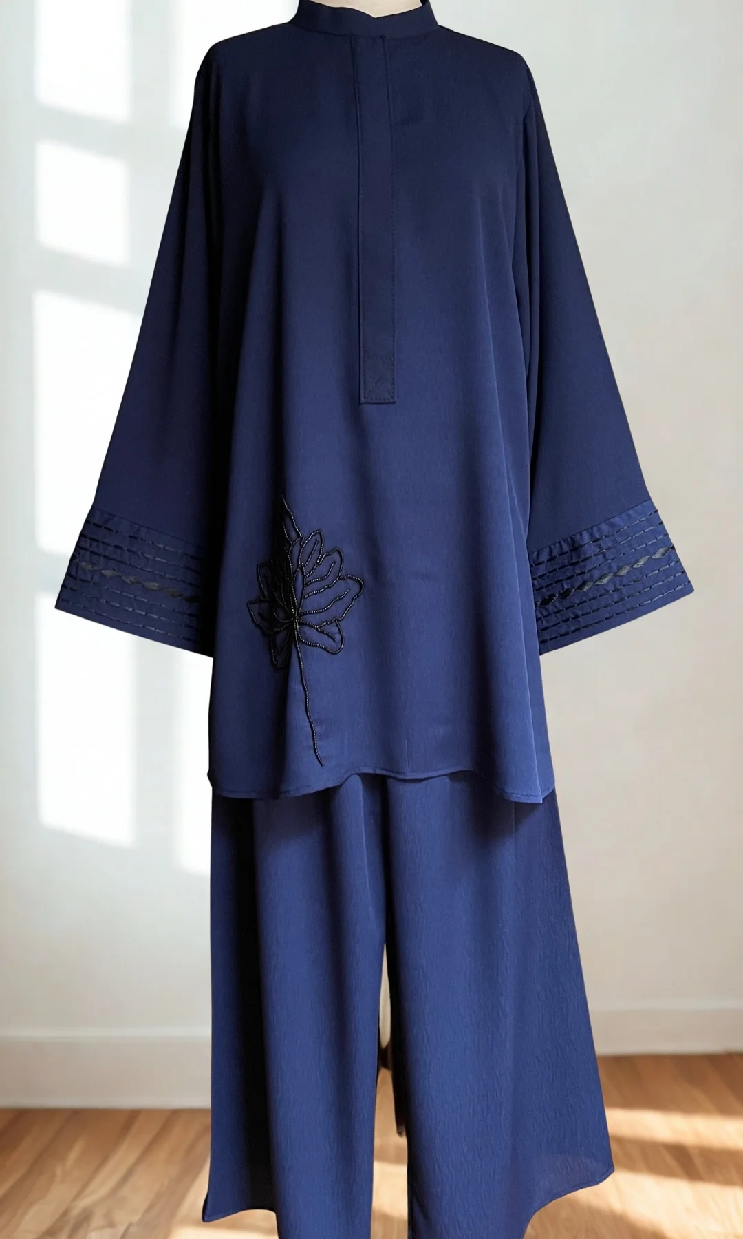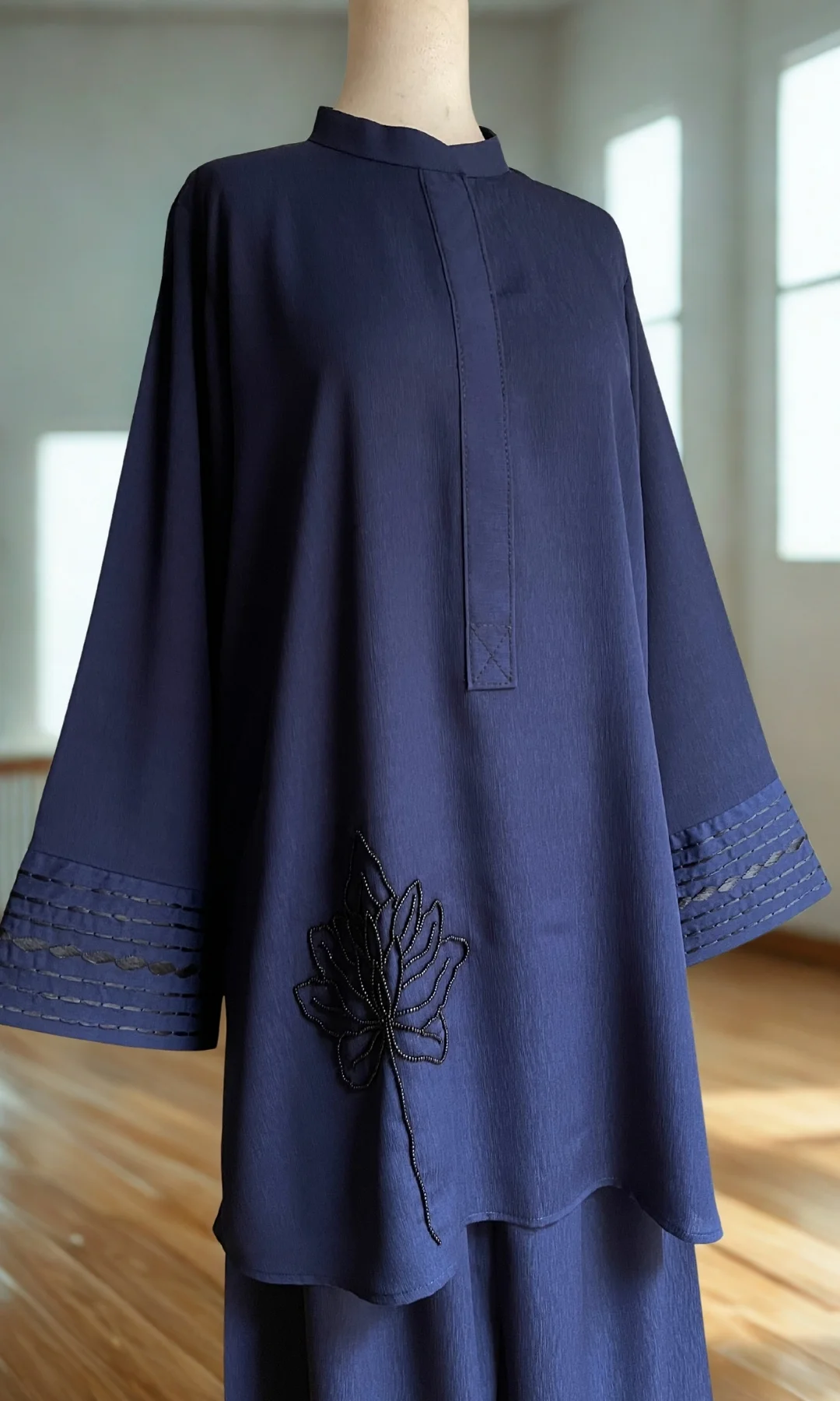 Inspired by a botanical scenery, this hand-embroidered pearl work on the front is an indication of delicacy with elegance. Hand embroidered kaantha sleeves complete the look along with stitching details around the neckline. Paired with flared wide legged trouser.