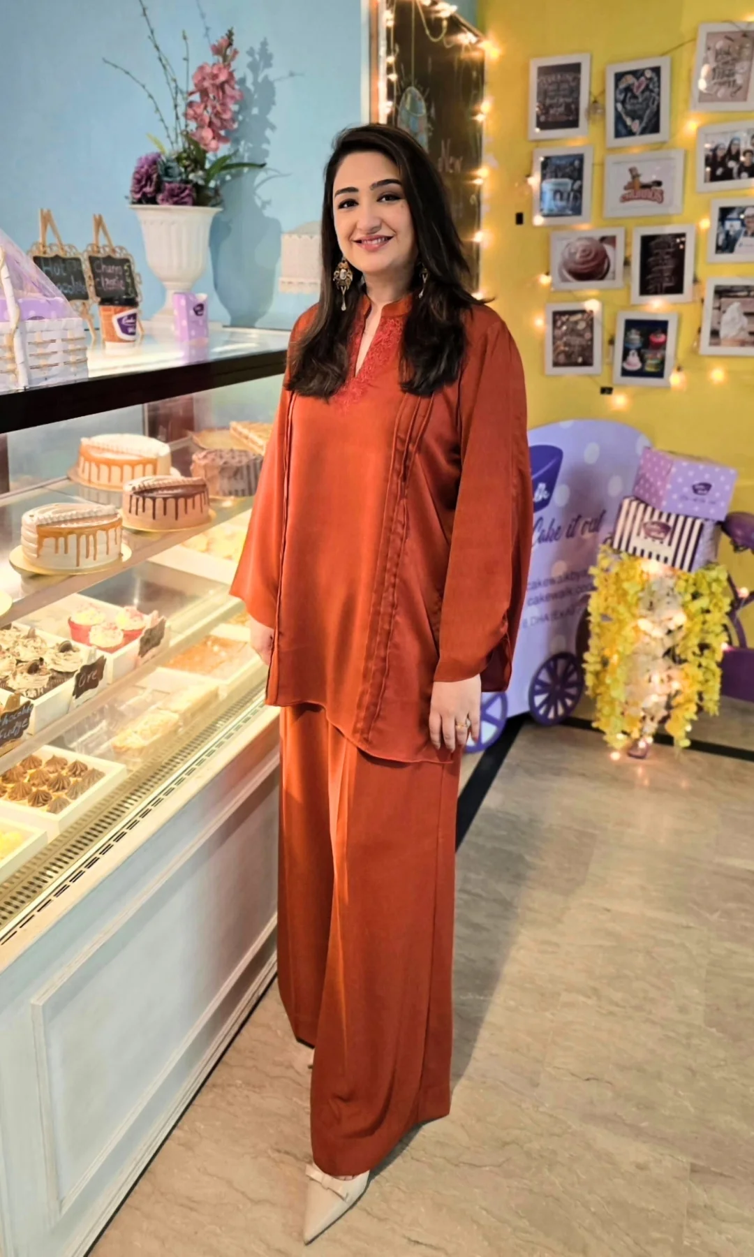 This two-piece outfit is thoughtfully crafted to bring comfort and sophistication to your wardrobe. Aar embroidery around the neckline is perfectly suited to complete the look with pleats on the front. Paired with flared wide legged trouser.