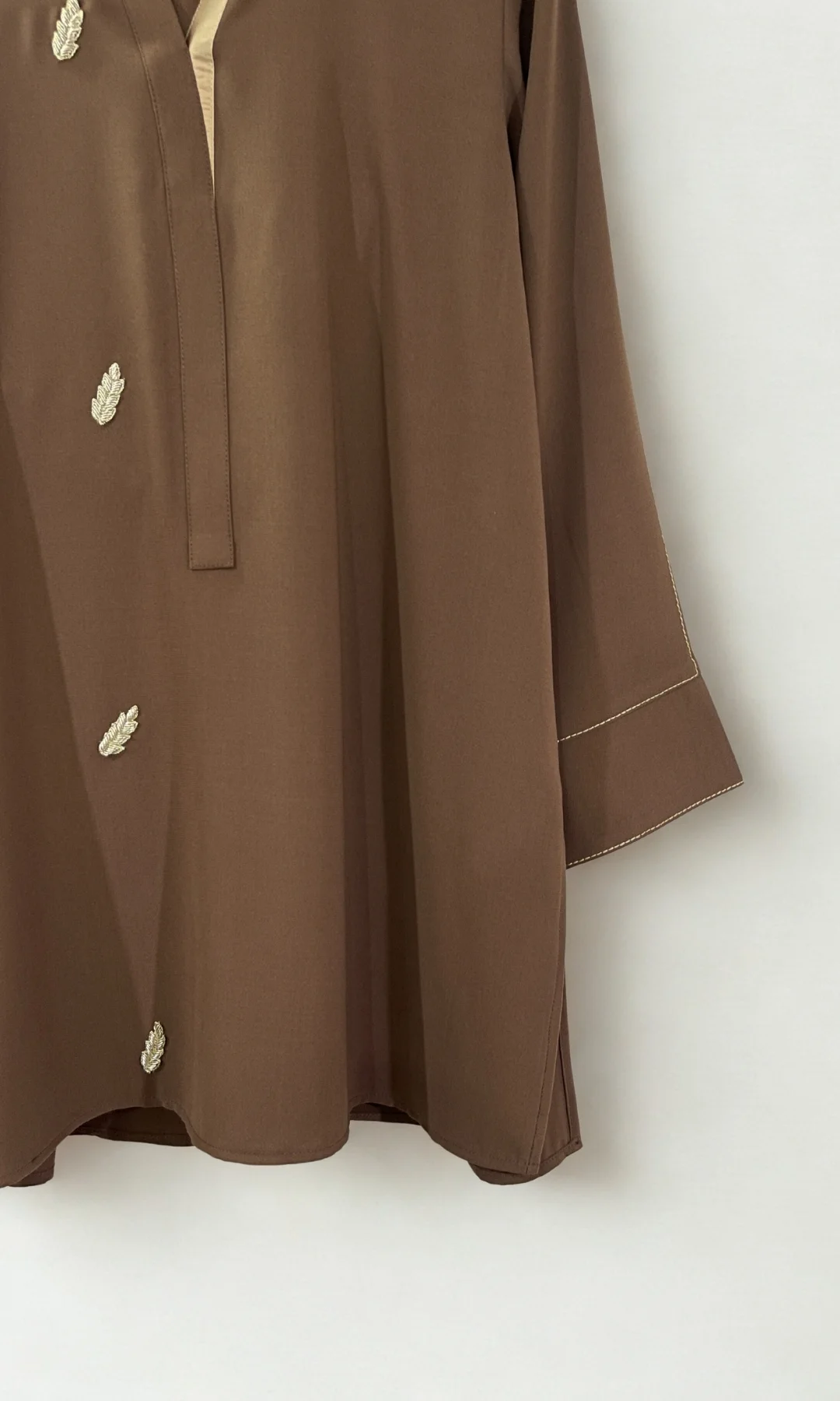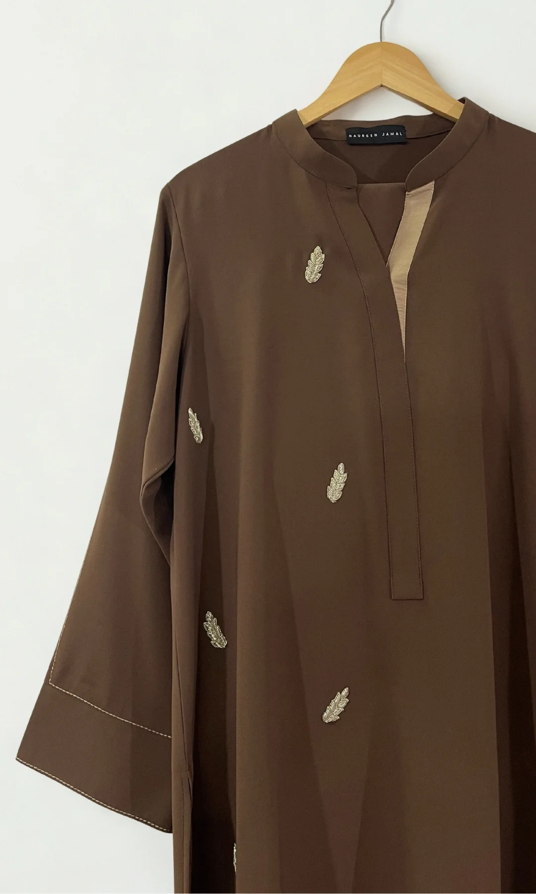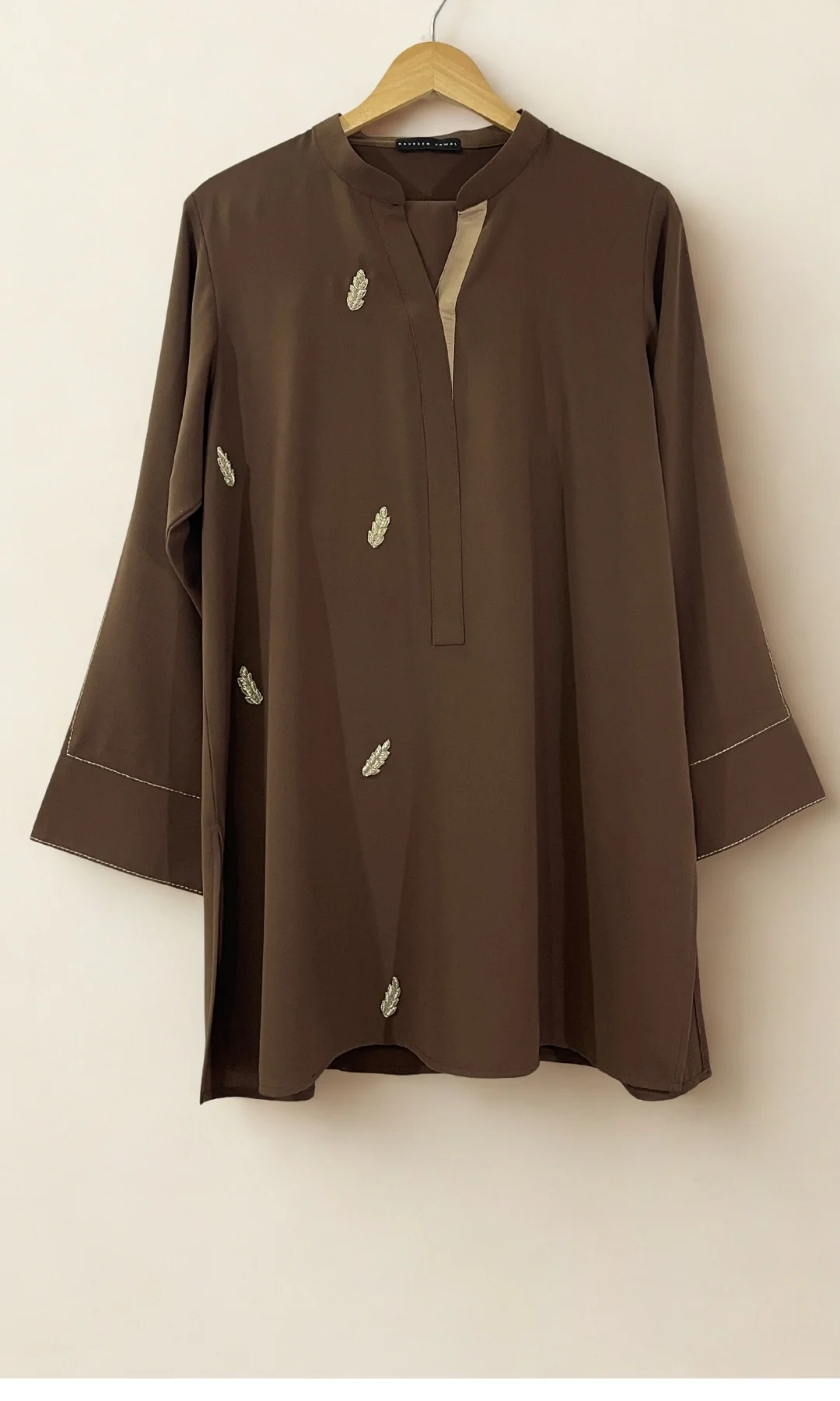 This chocolate brown shirt features delicate handmade kora leaf embroidery in muted gold tones, adding depth and artisanal charm. Accented with a sleek band collar and contrasting inner neckline detailing, it is styled with loose straight trousers for understated sophistication.