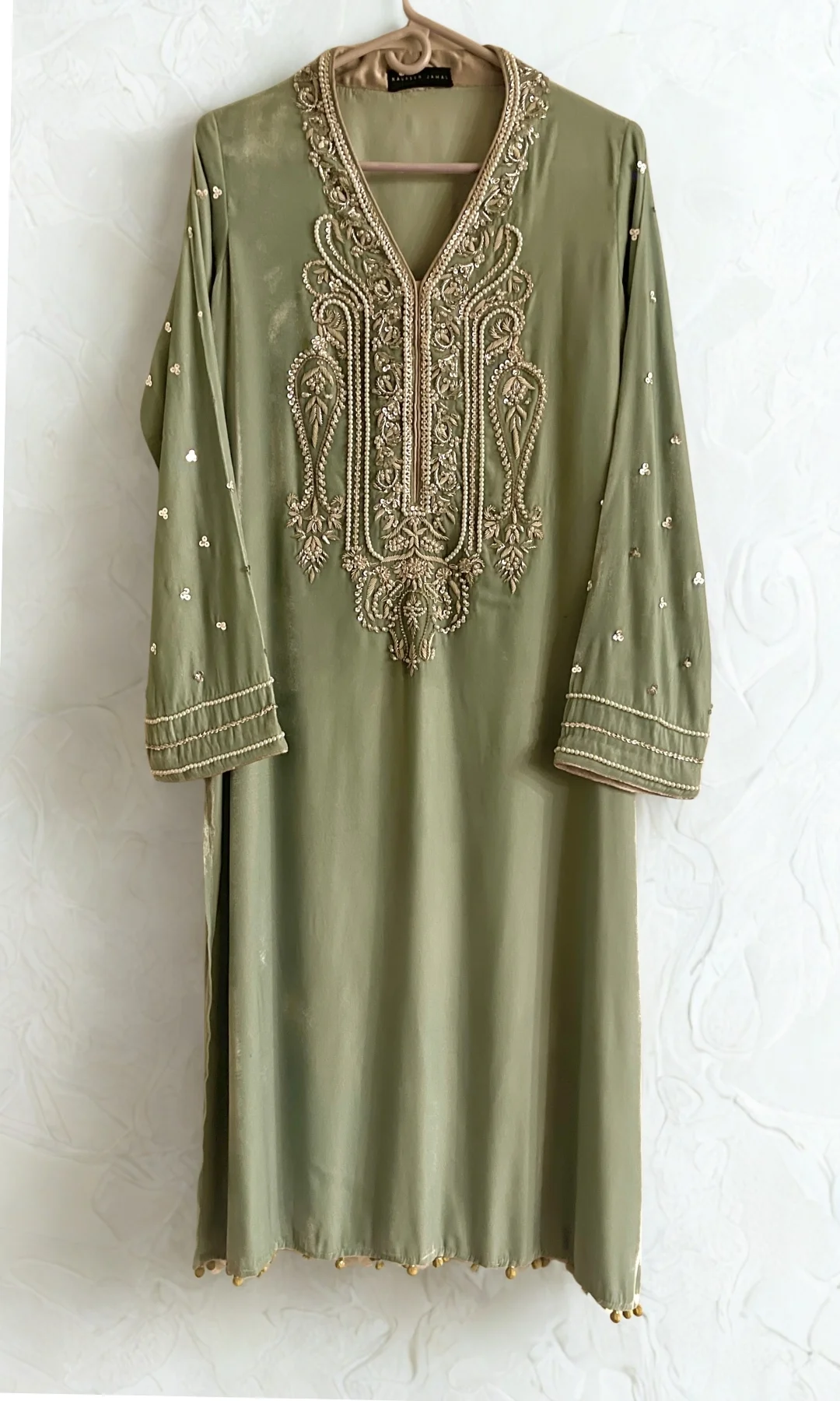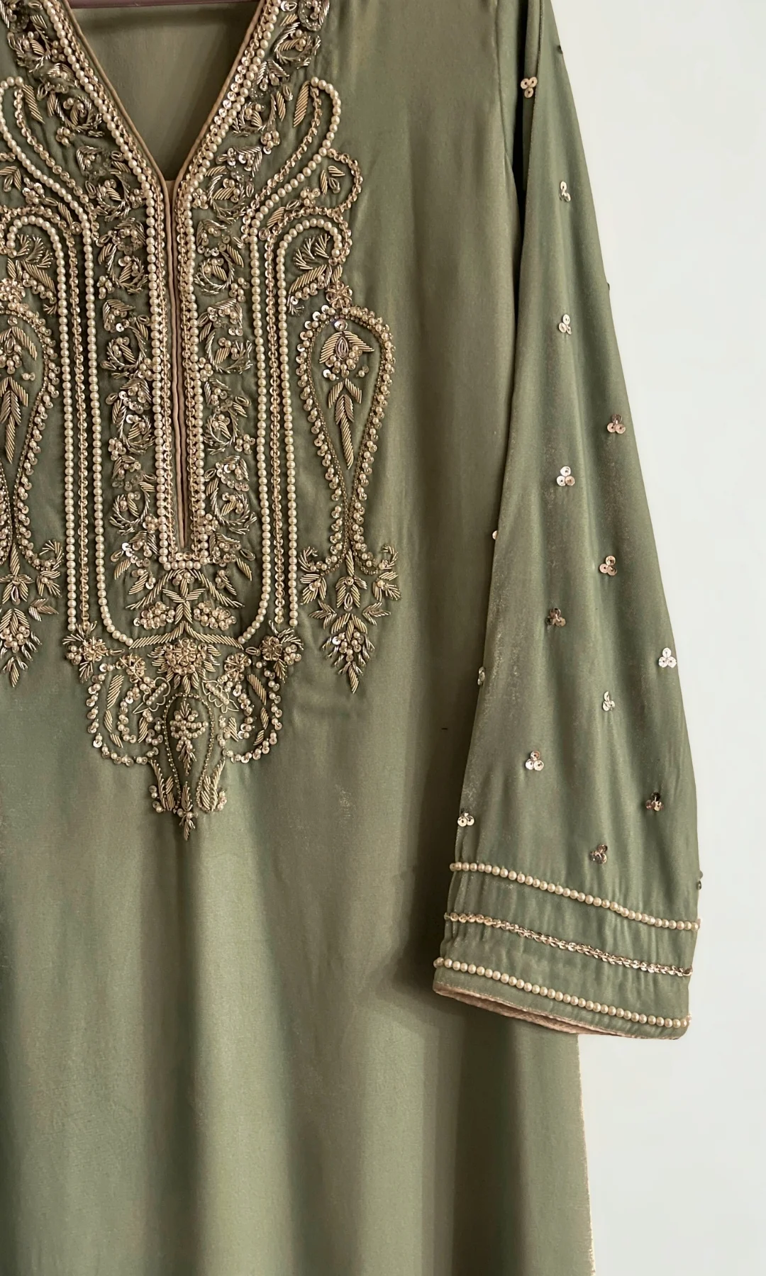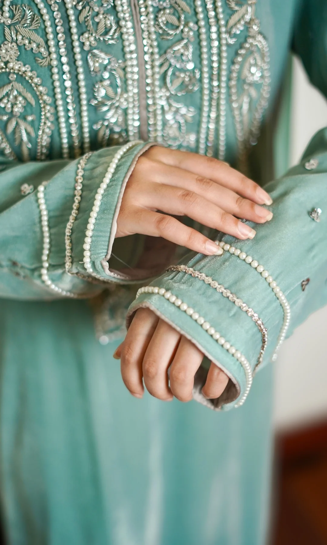 Coco Bloom, a straight cut pure velvet shirt, accentuated with silver pearls and bead zardozi handwork with sequins scattered on the entire sleeve length.