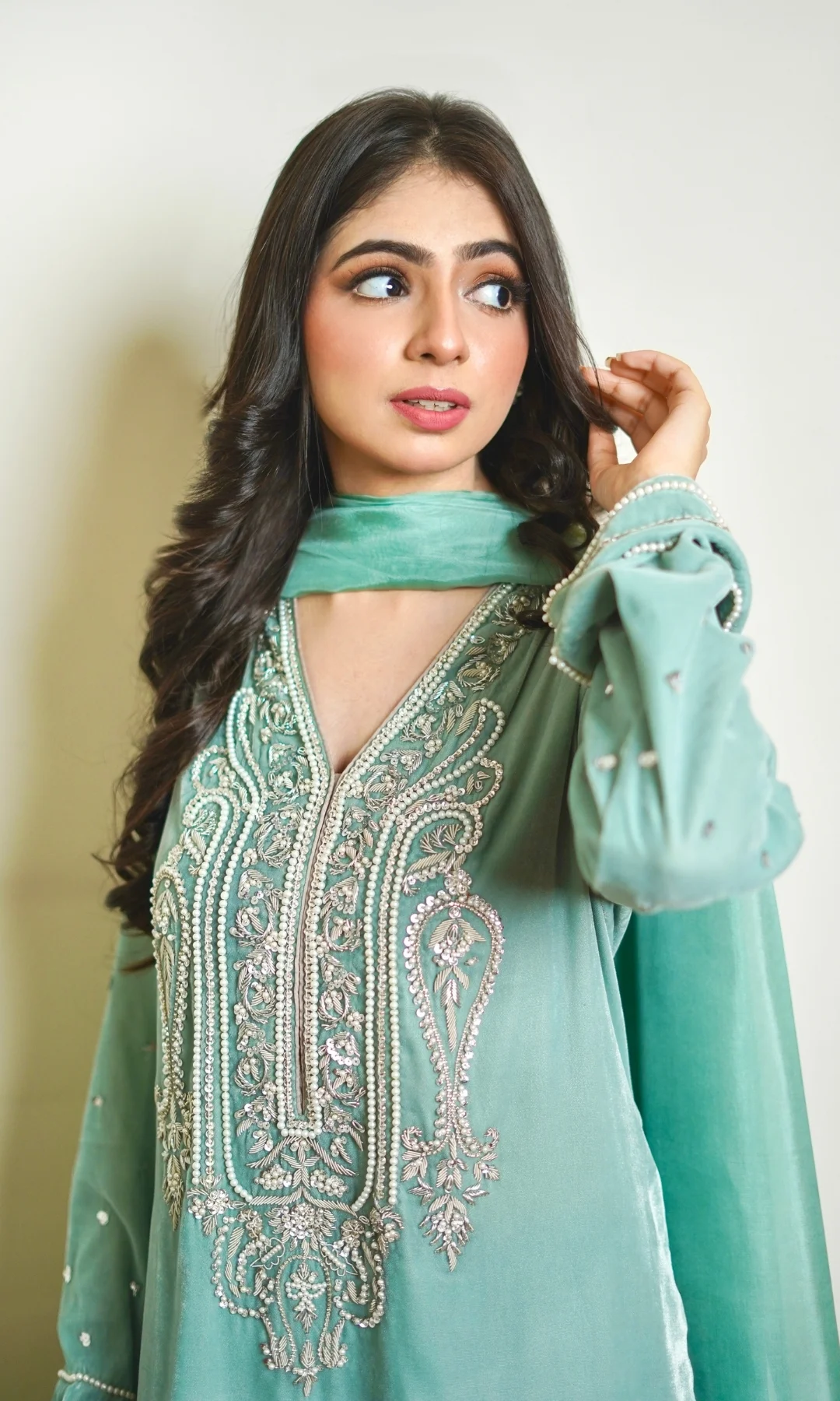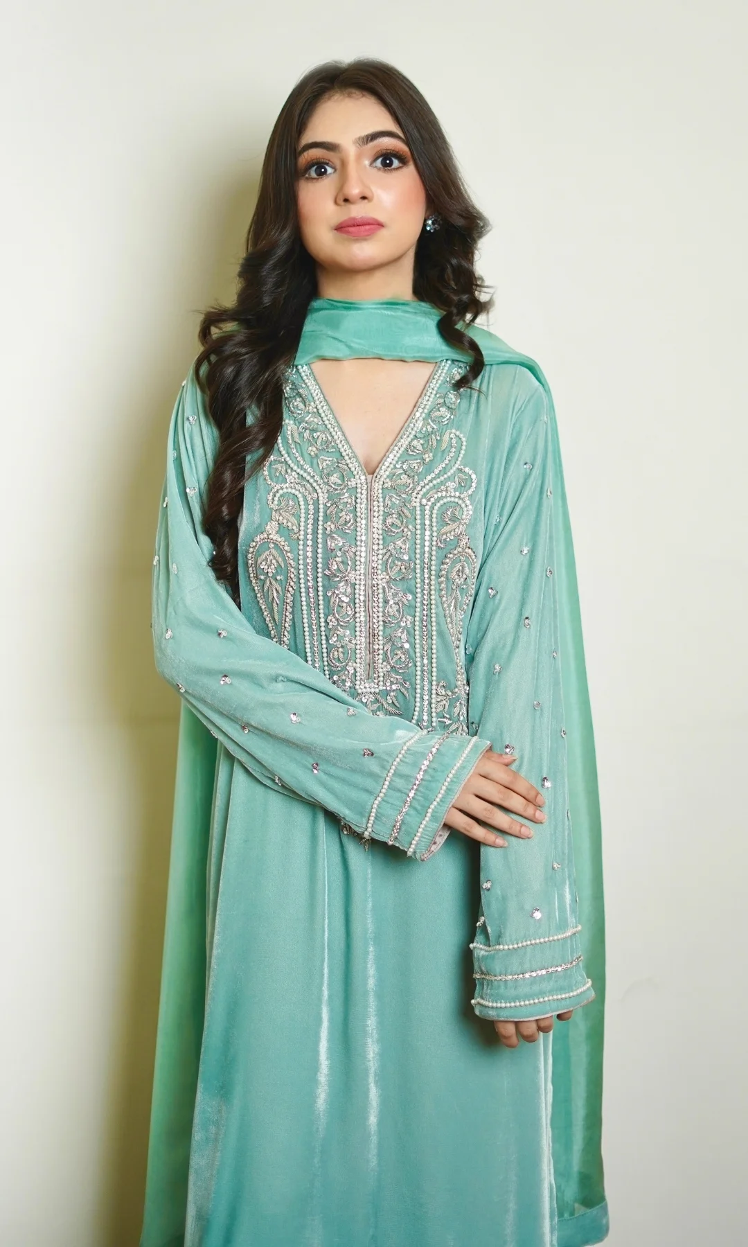 Paired with matching velvet straight cut trouser. Dupatta finished on all edges.