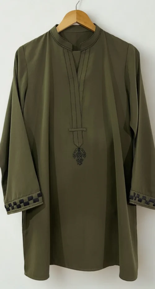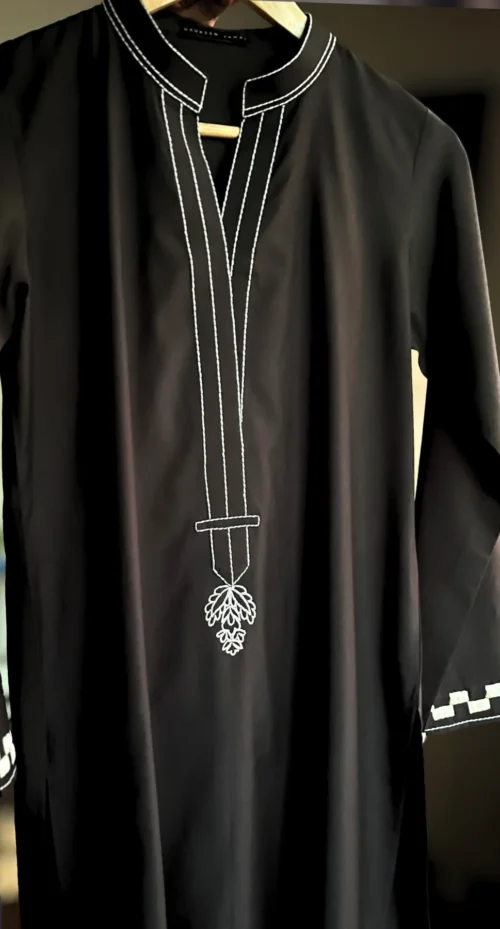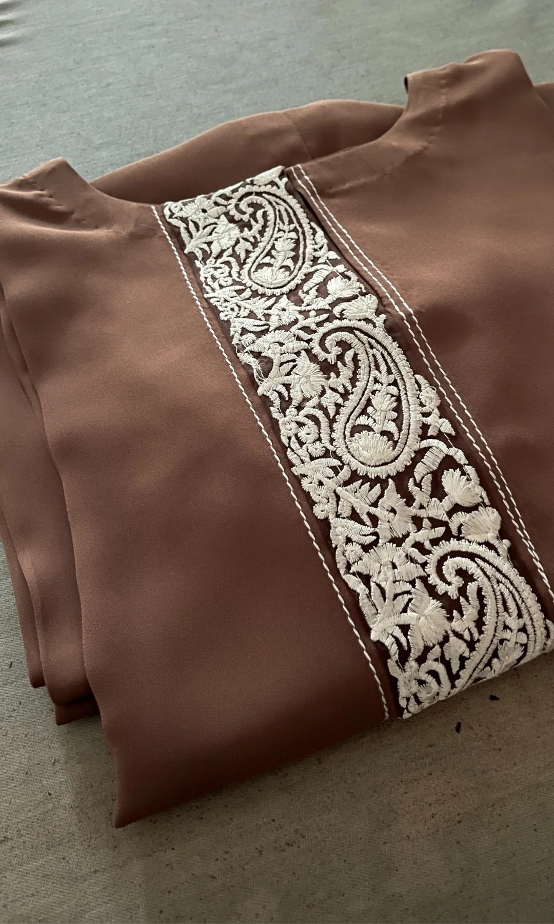 A two piece stylish Coord featuring an intricate embroidered neckline with stitching details, wide cuff finished with button detailing for a graceful cutline.