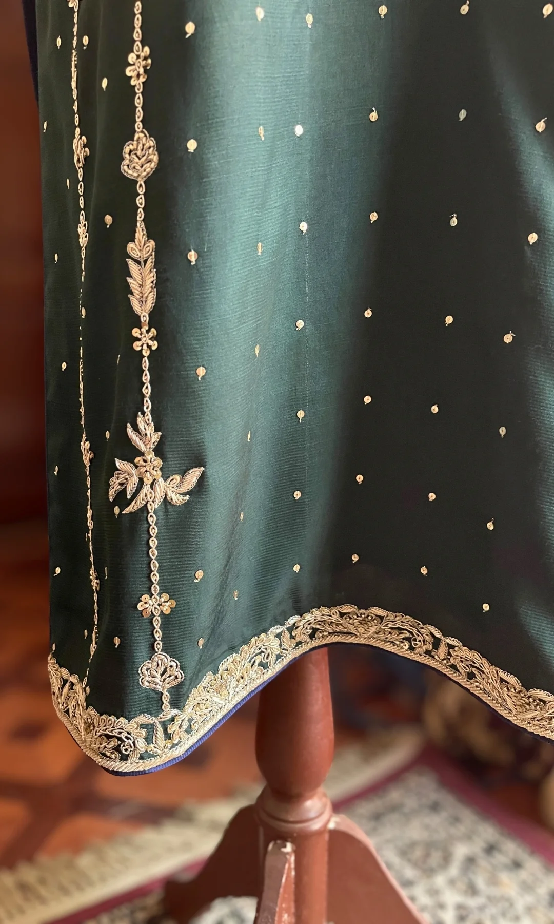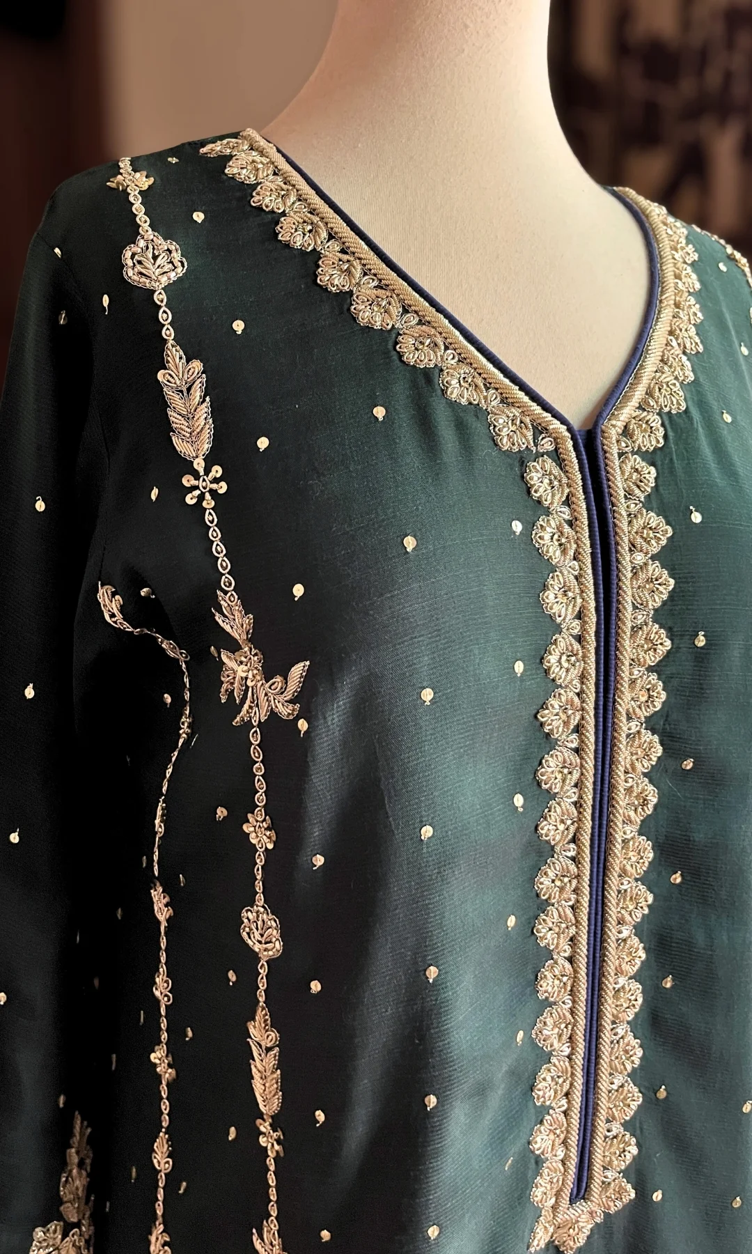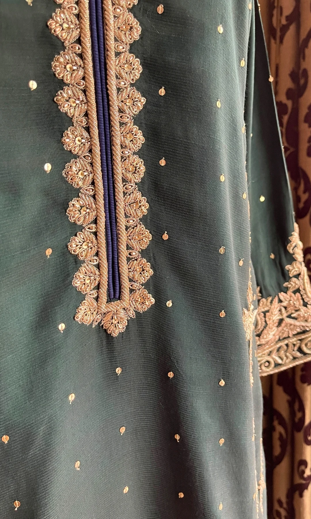 Paired with flaired Raw silk Trouser. Dupatta enhances the overall look with sequin sprinkles all over with jamavar facing all sides.