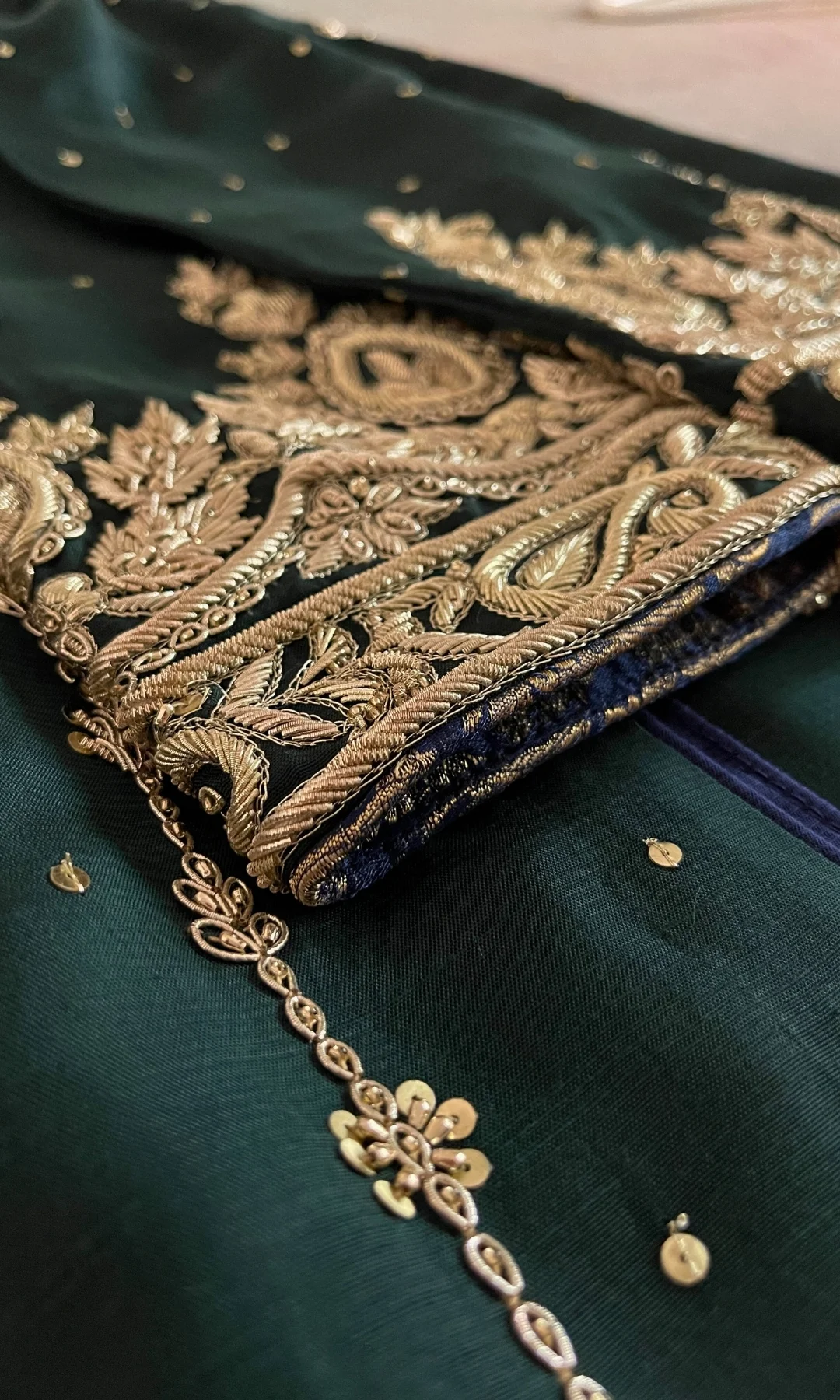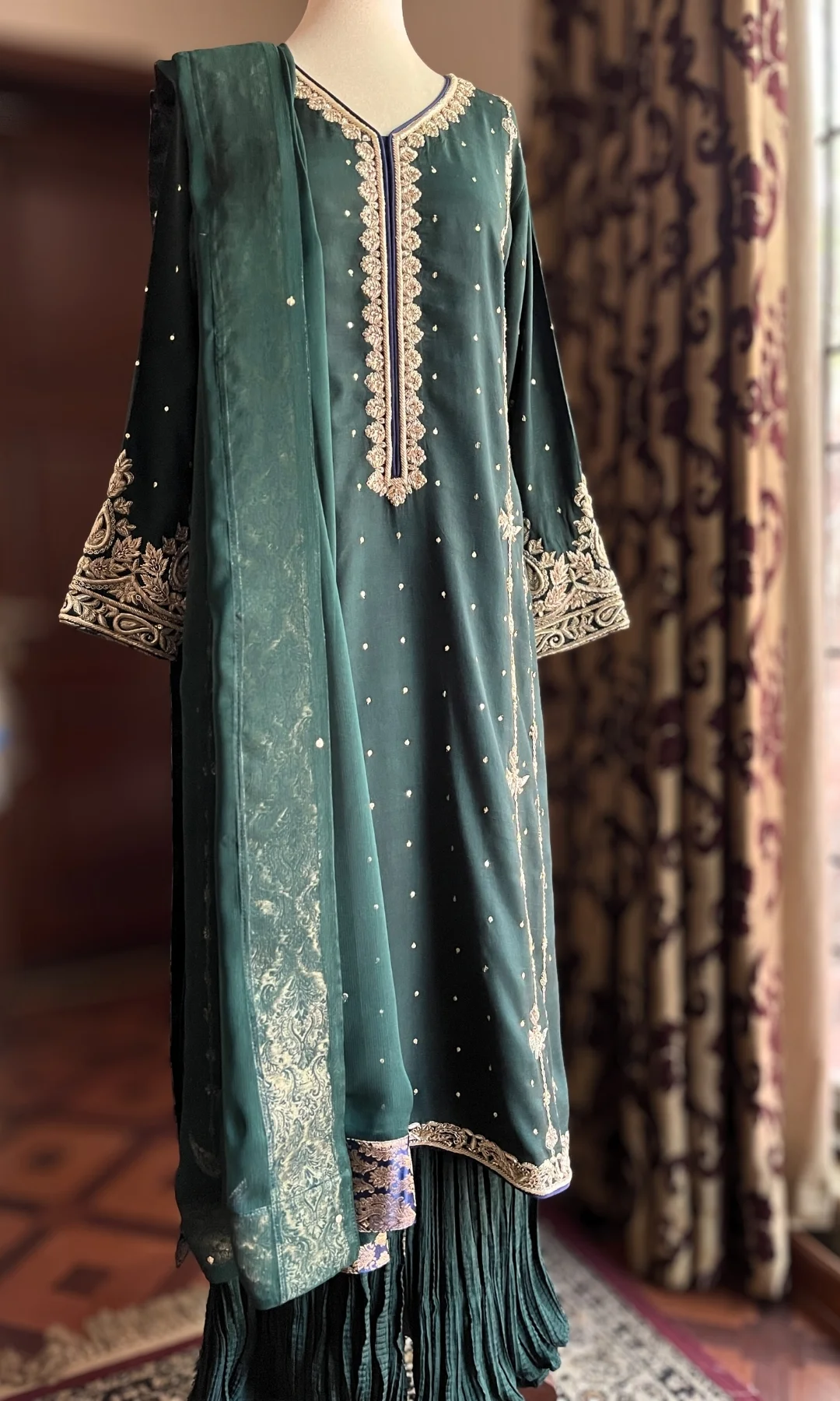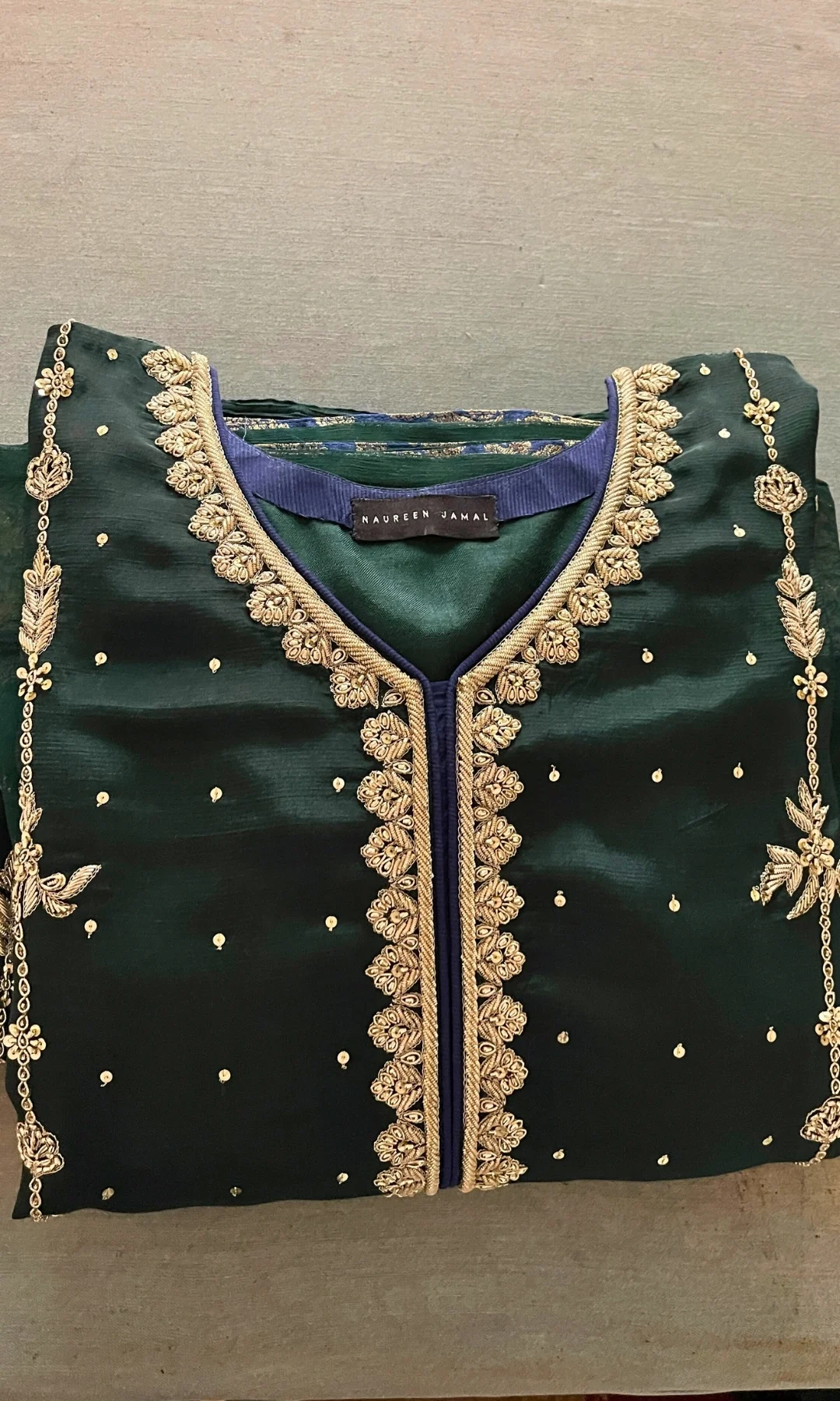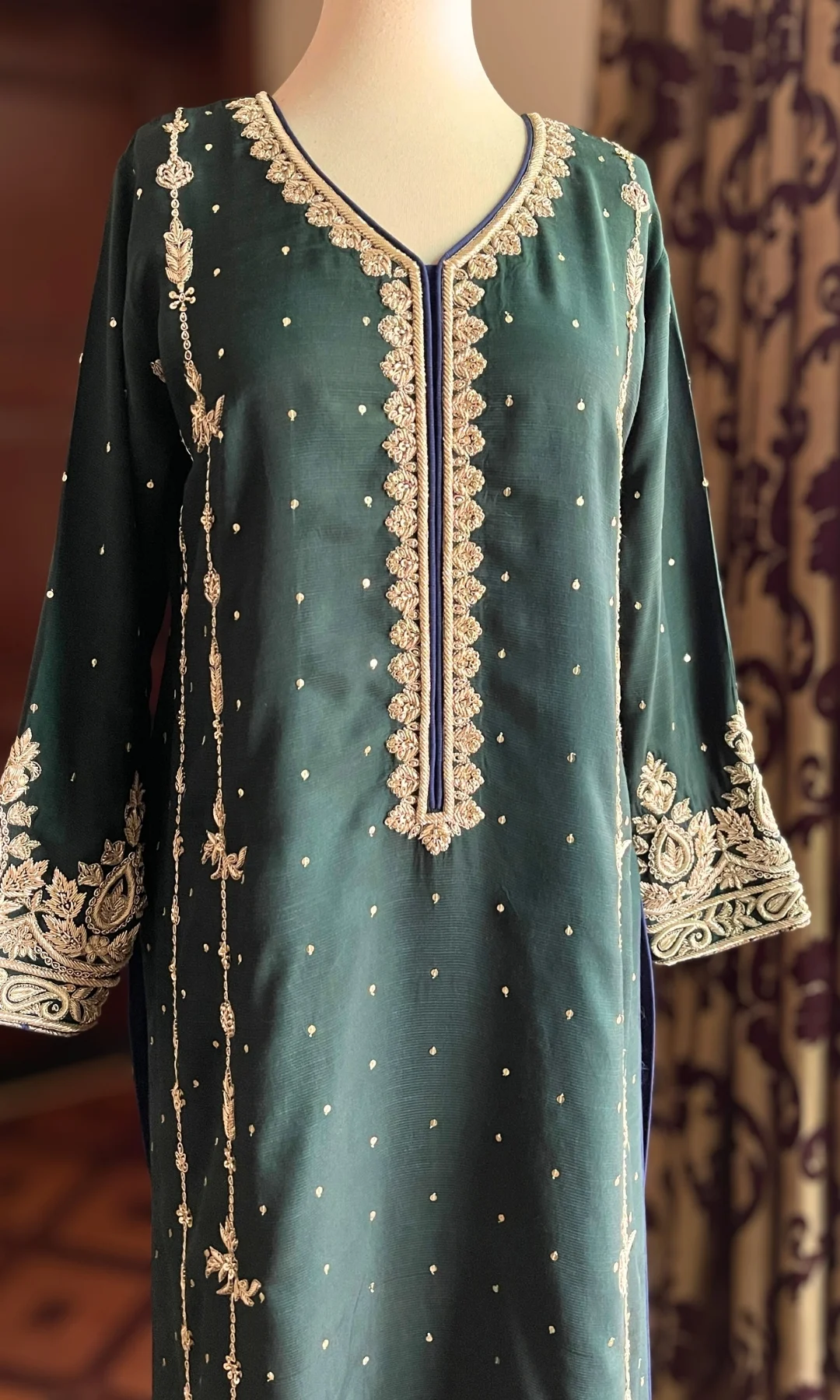Paired with flaired Raw silk Trouser. Dupatta enhances the overall look with sequin sprinkles all over with jamavar facing all sides.