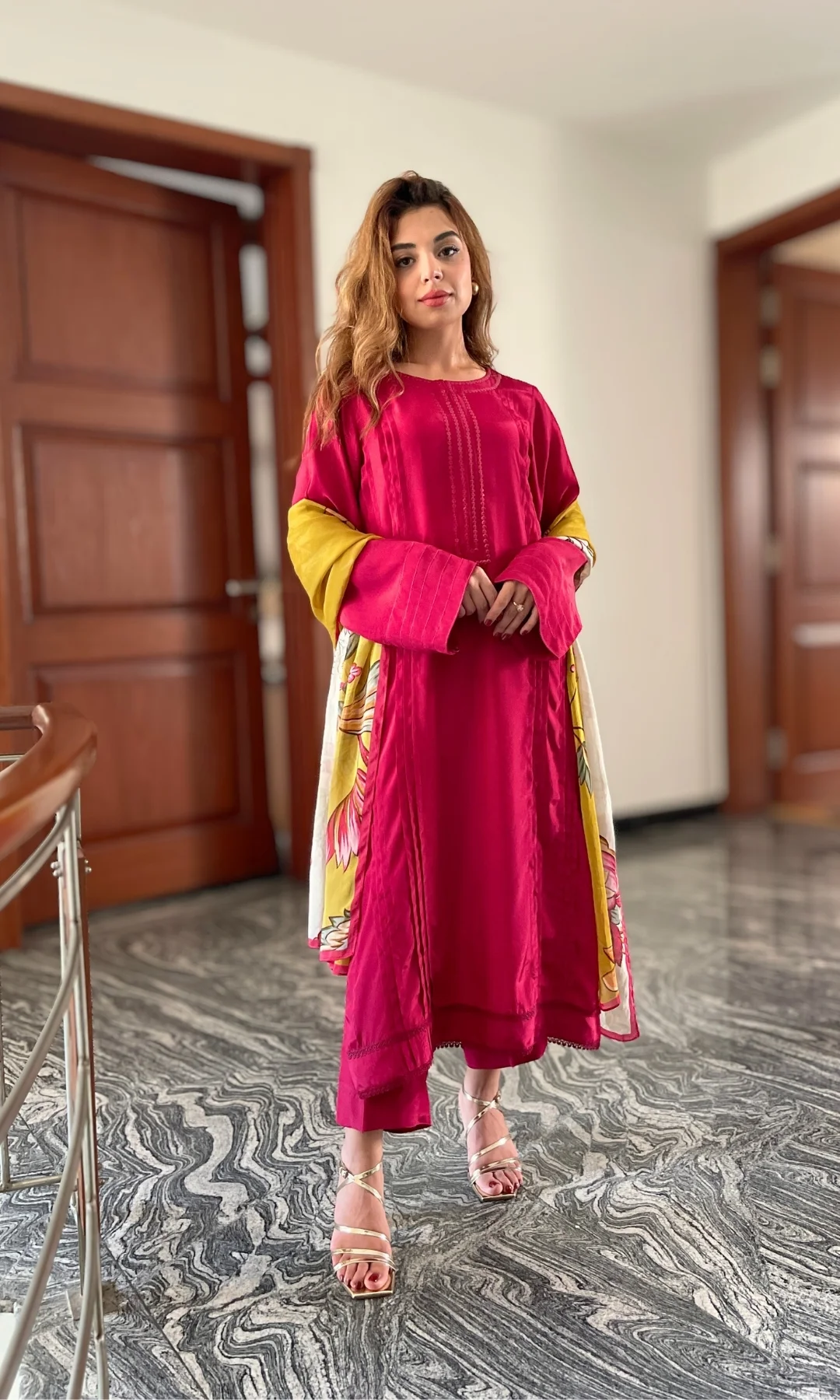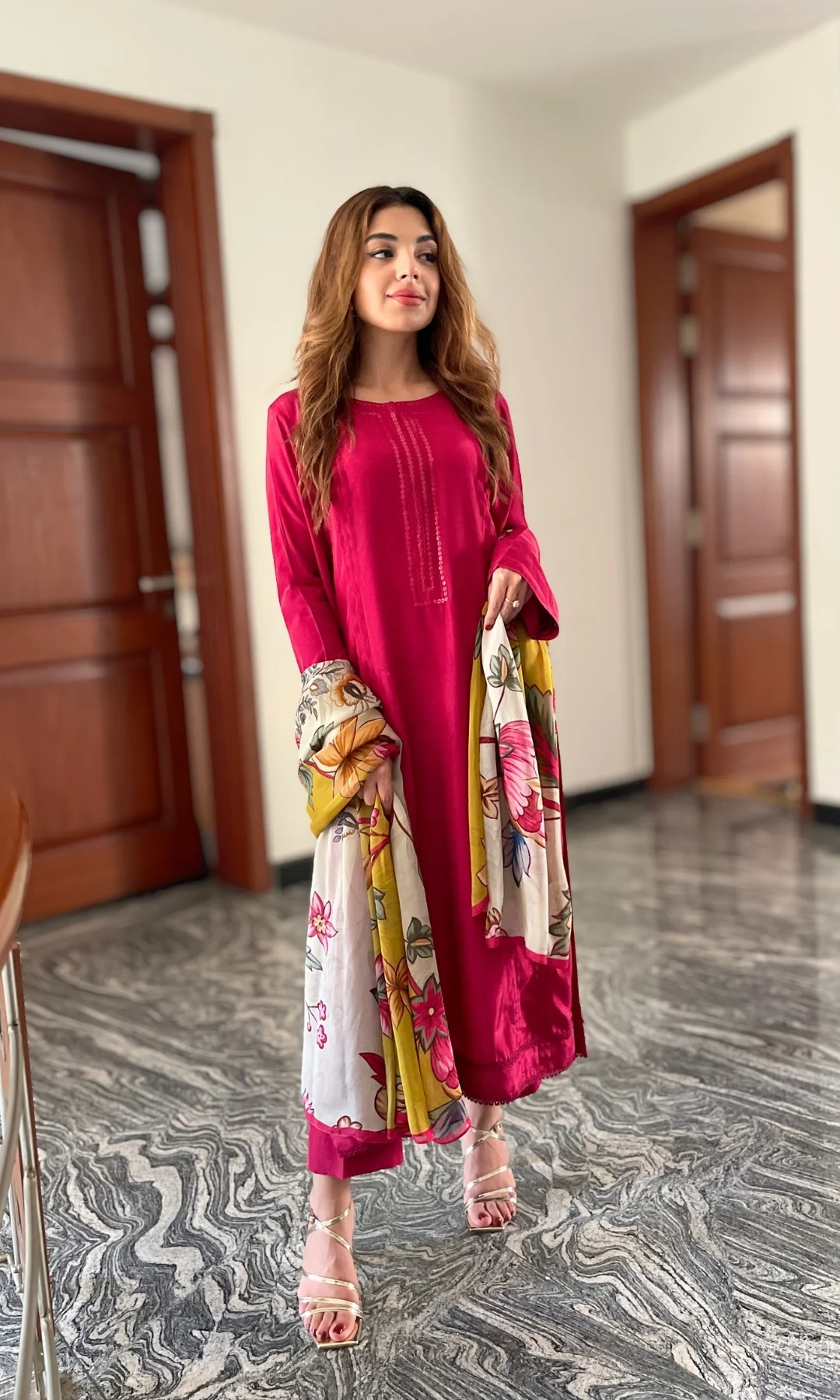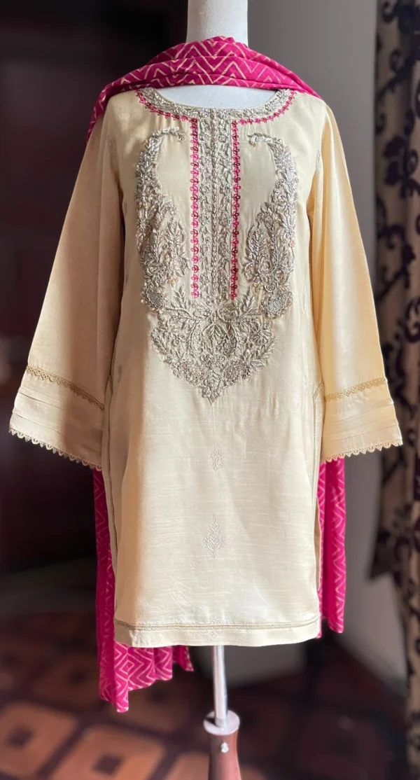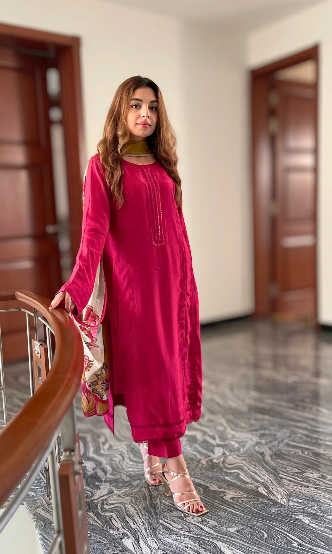 Paired with plain, raw silk trousers. Option of Printed Silk Dupatta or plain Chiffon dupatta.