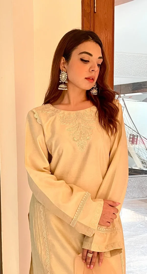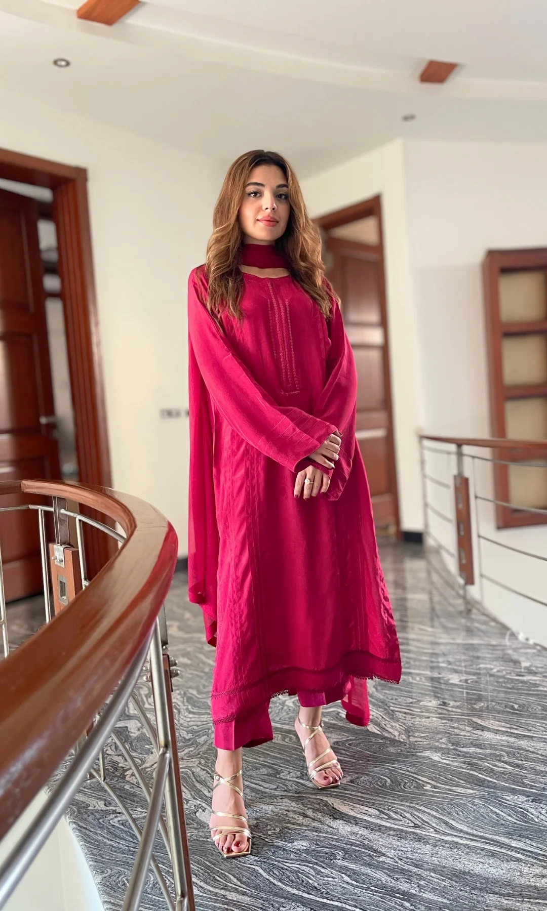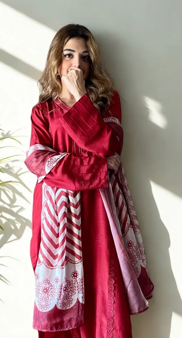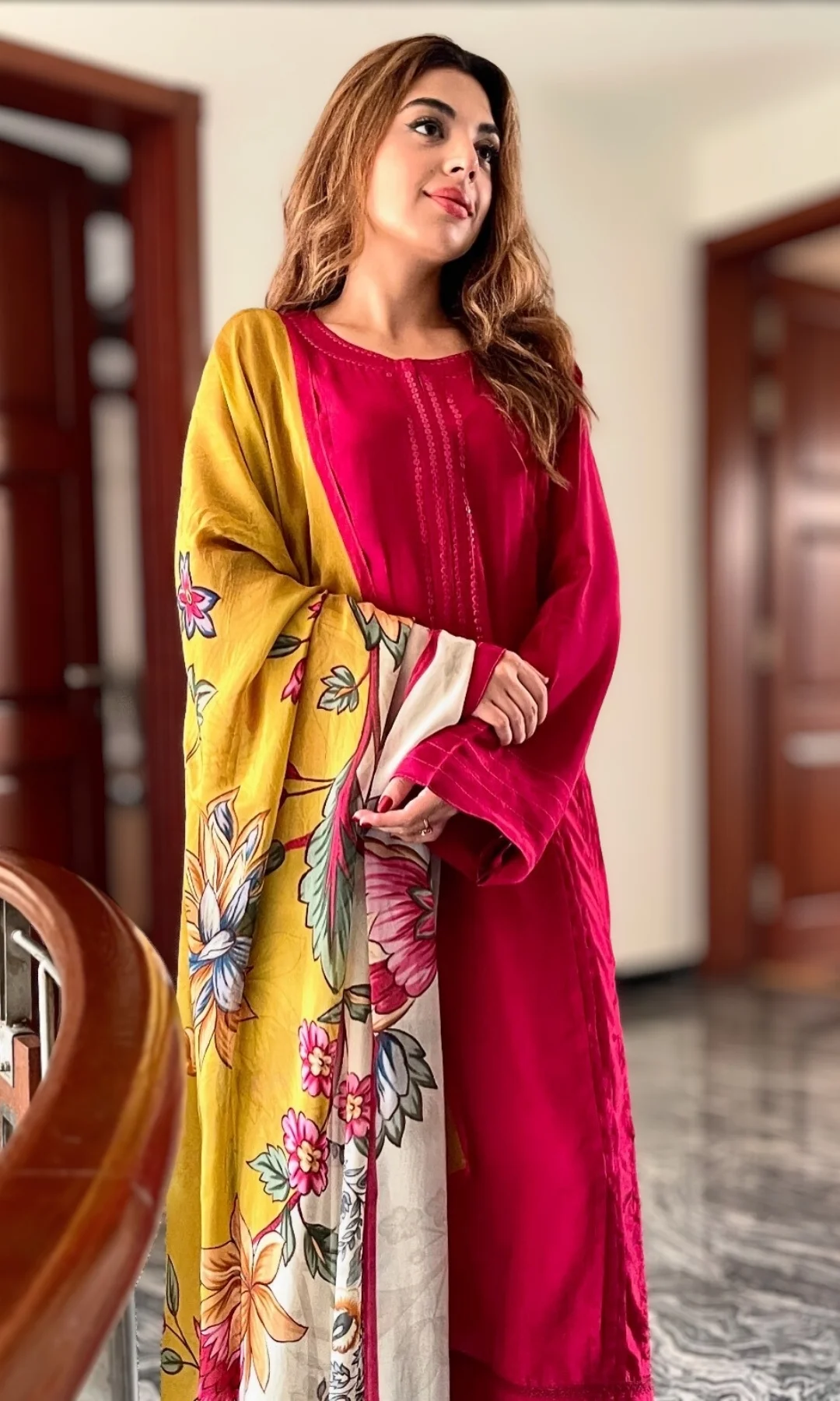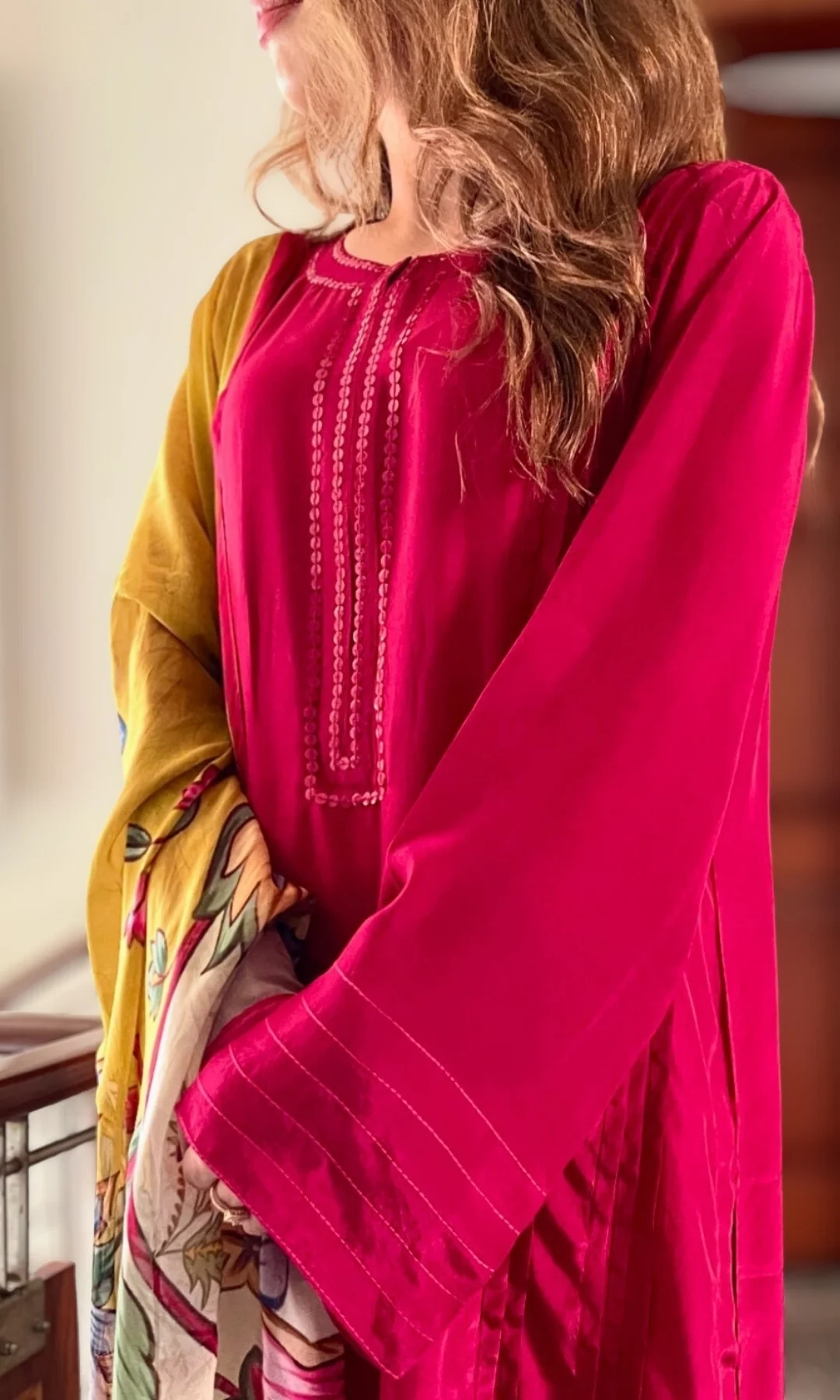 Paired with plain, raw silk trousers. Option of Printed Silk Dupatta or plain Chiffon dupatta.