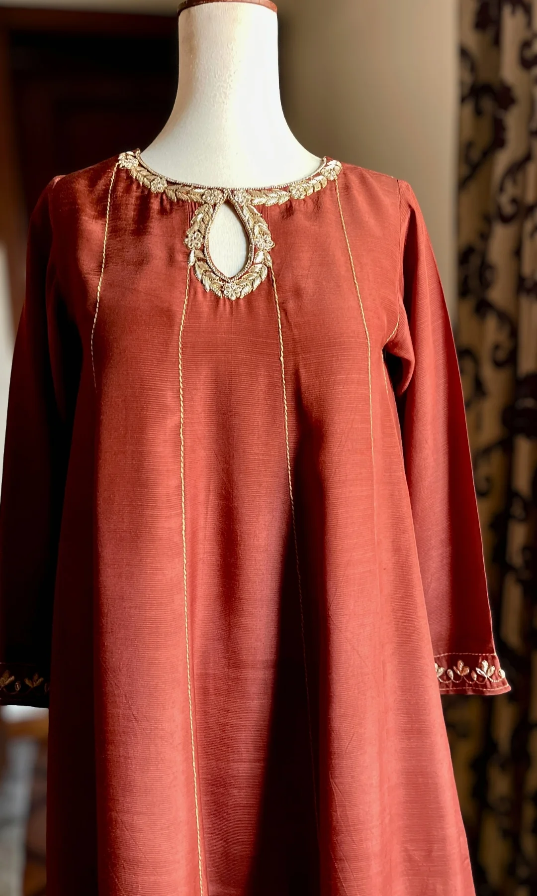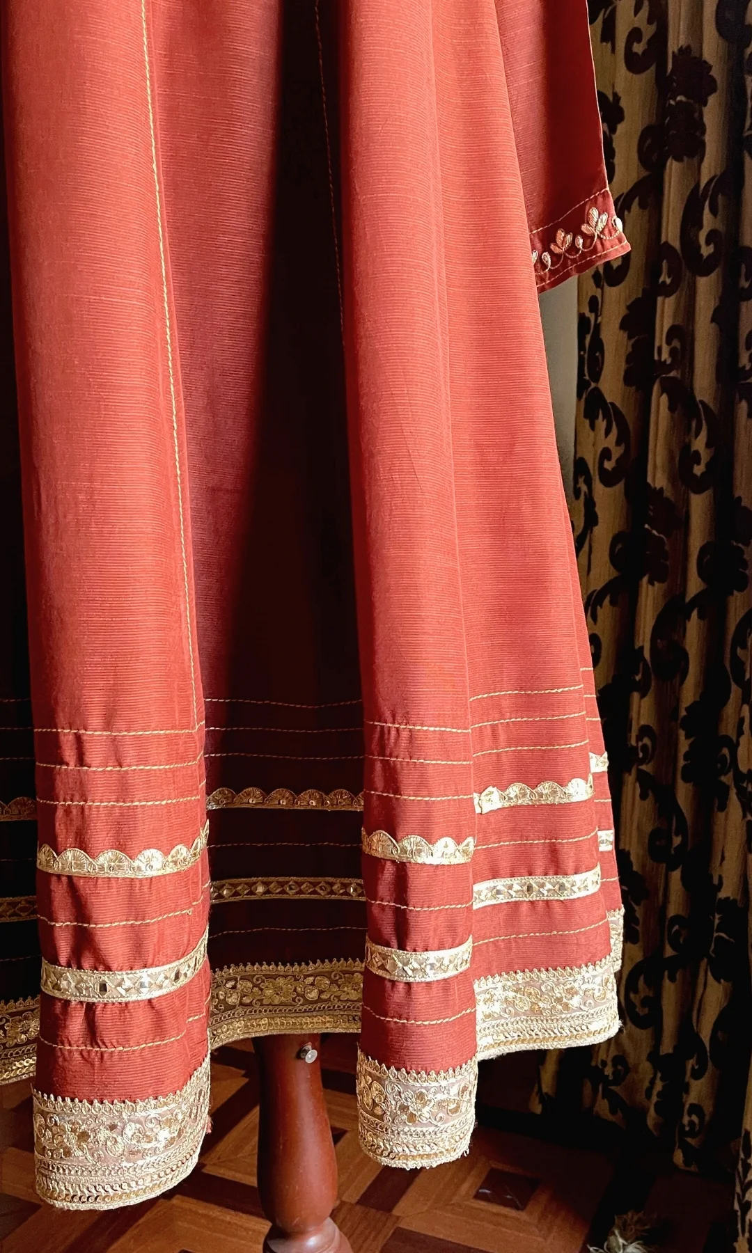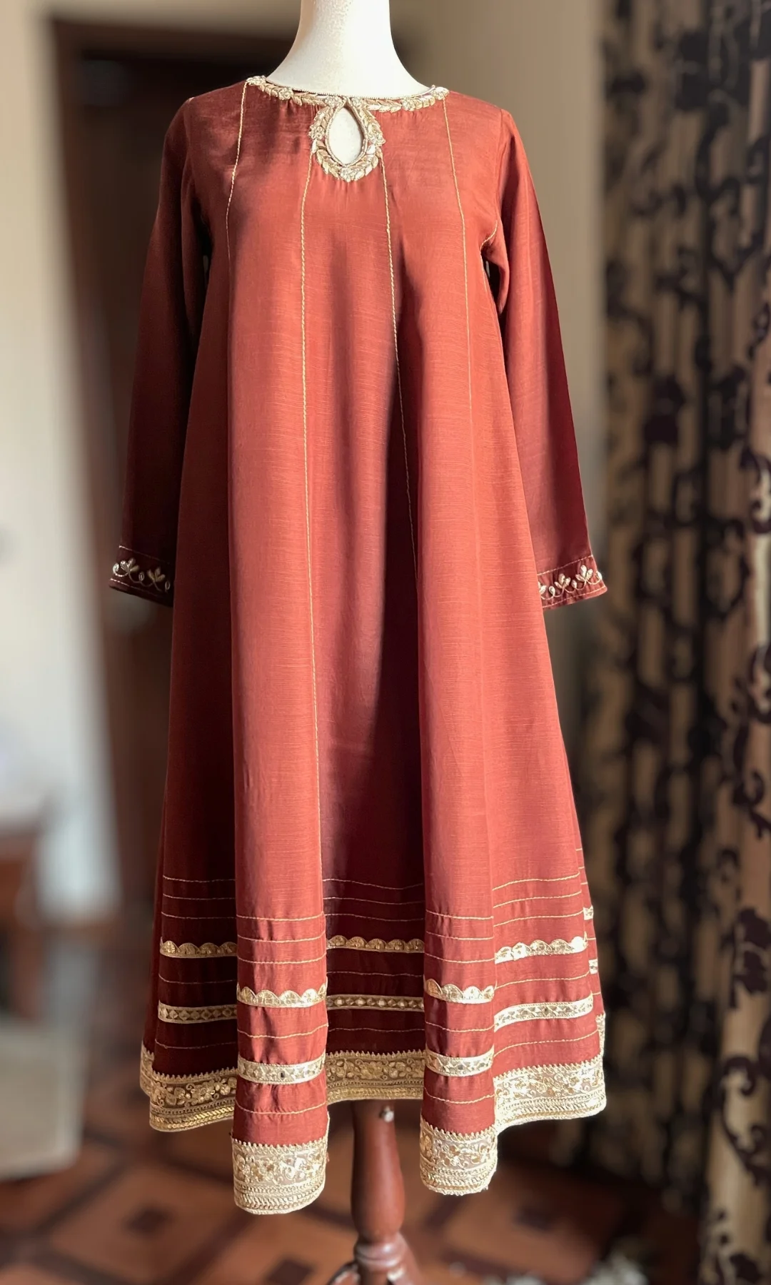 Step into elegance with this long A-line ensemble, featuring a keyhole neckline with hand-embroidered kora and sequin work alongside. Embroidered sleeves with detailing, and the lace work in daman complements the entire look. Paired with flared Raw silk Trouser. Dupatta finished on all sides.