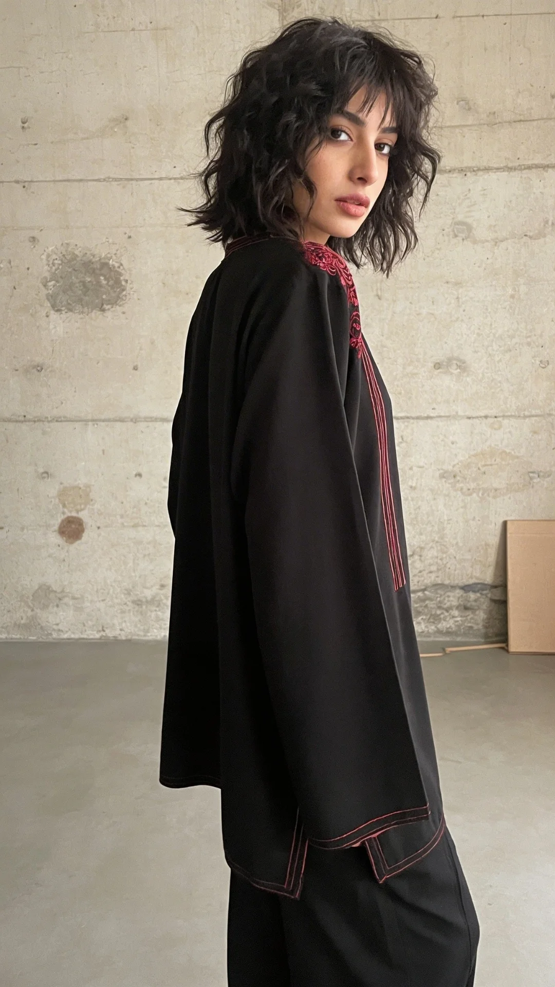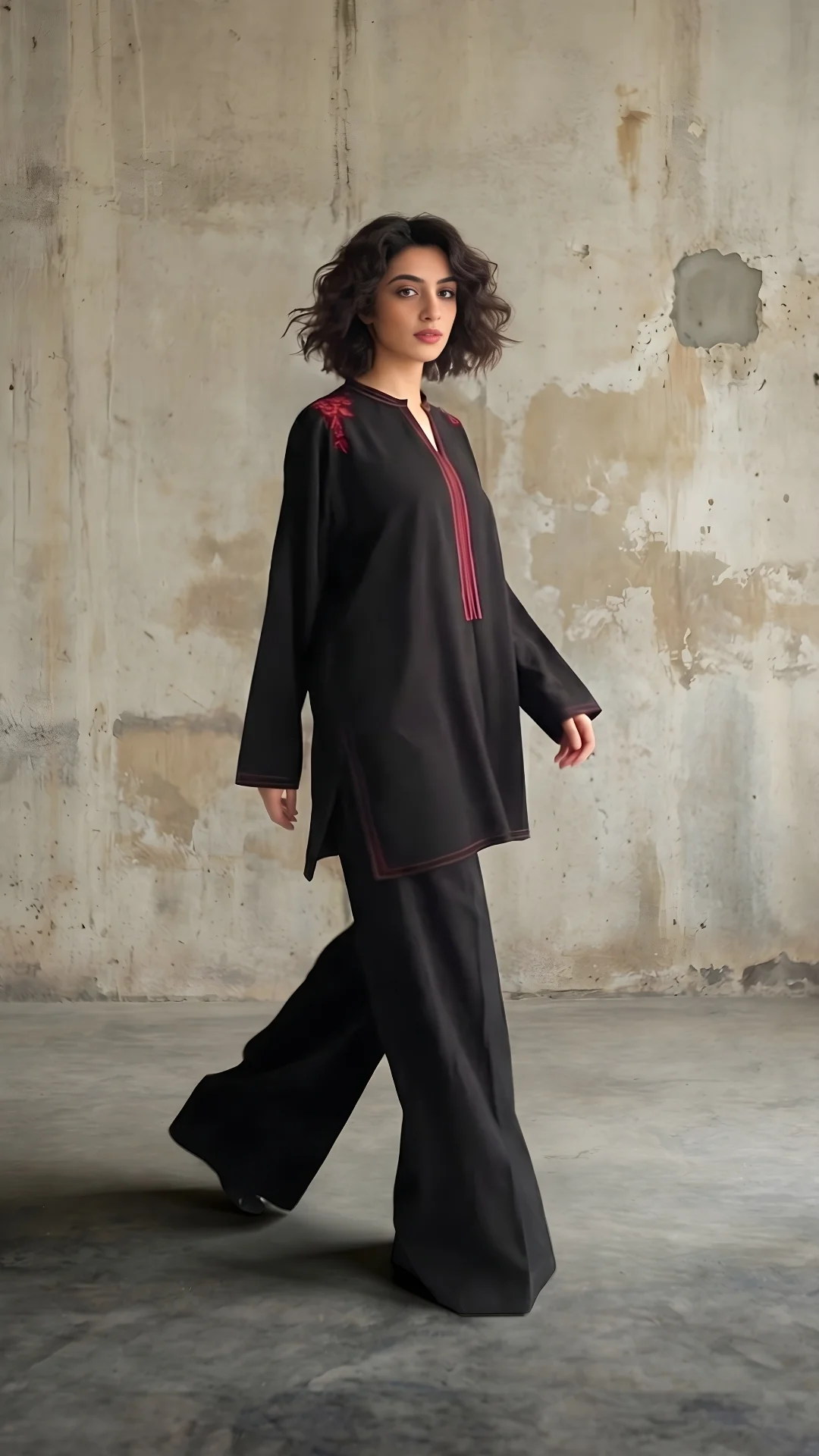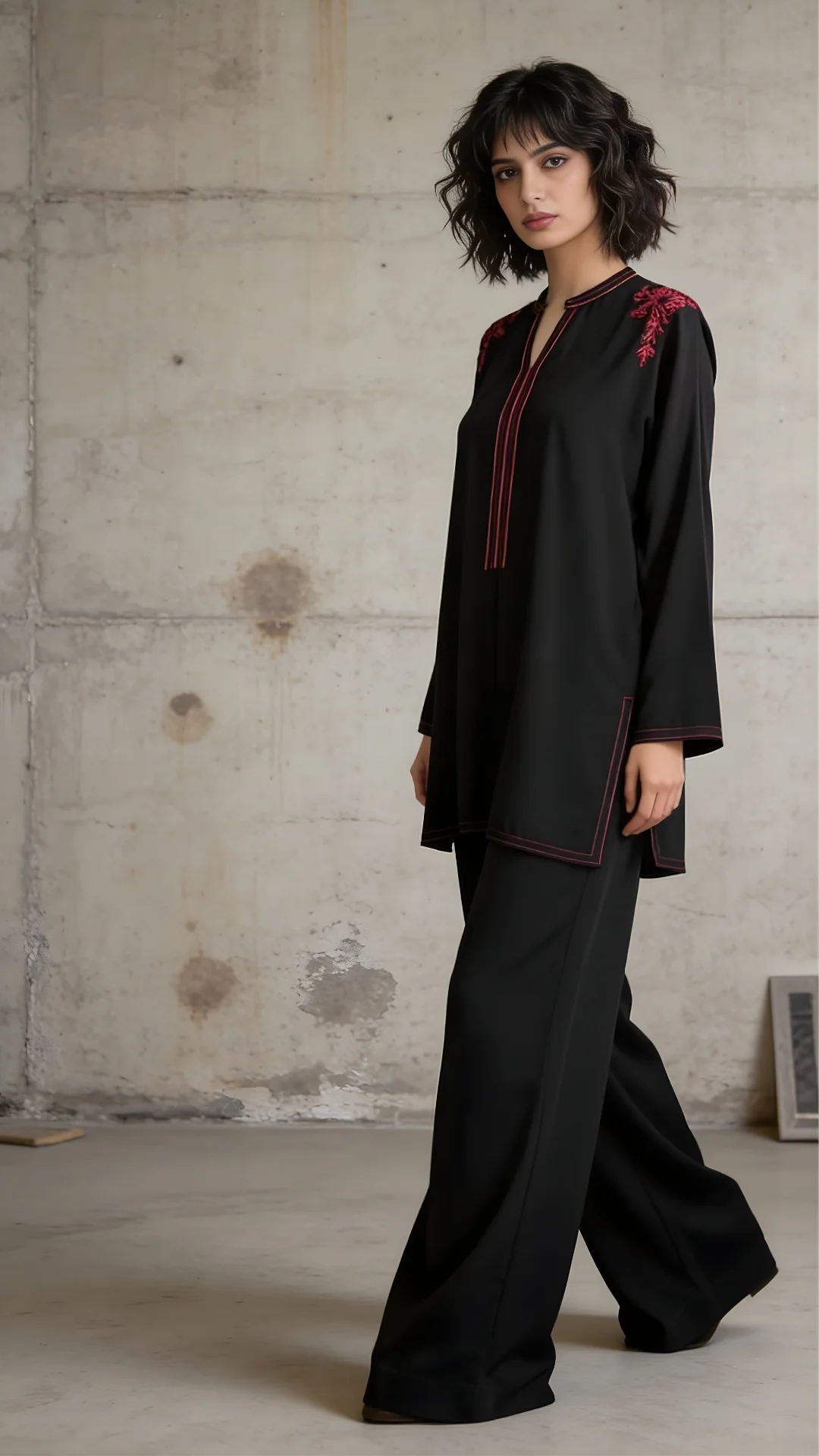 Stunning black premium crepe flowy cut, baggy top, with pretty hand embroidered, resham aari embroidery on the shoulders with stitching details over the neck line, chalks, daman and sleeve ends. Complemented with loose flowy black trousers.