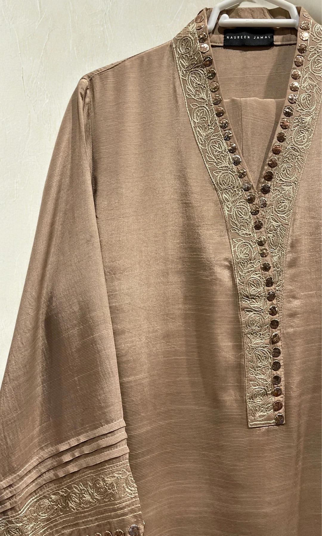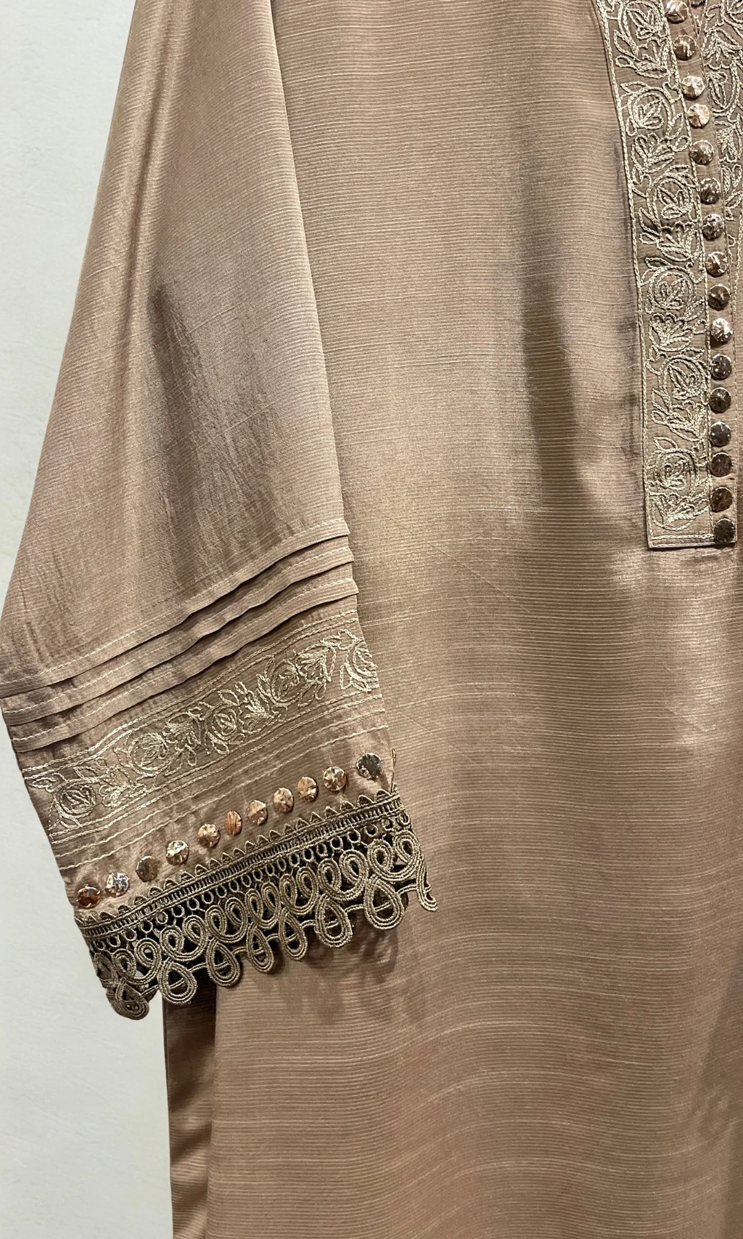 This beige shirt is enriched with resham handwork with pleat detailing and handworked  mukesh details around the neckline and sleeve hem with lace detailing to give that graceful charm.