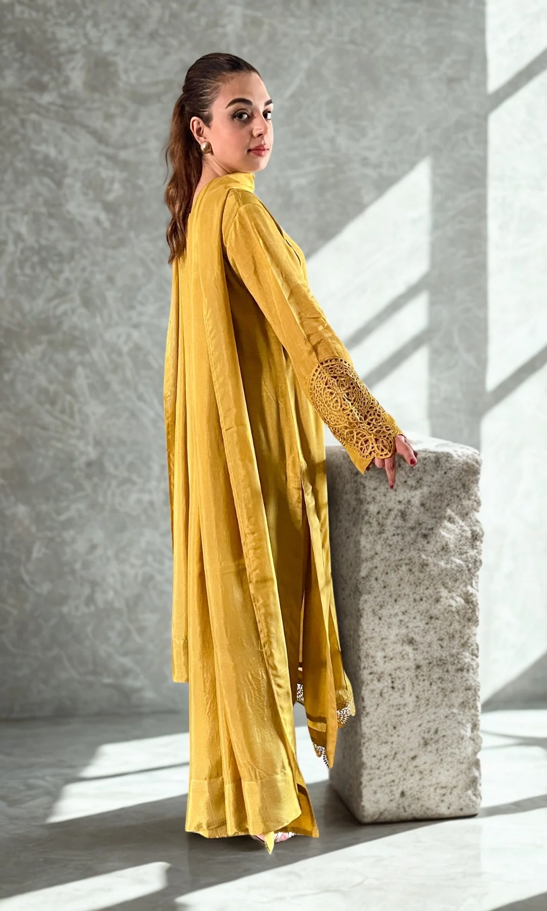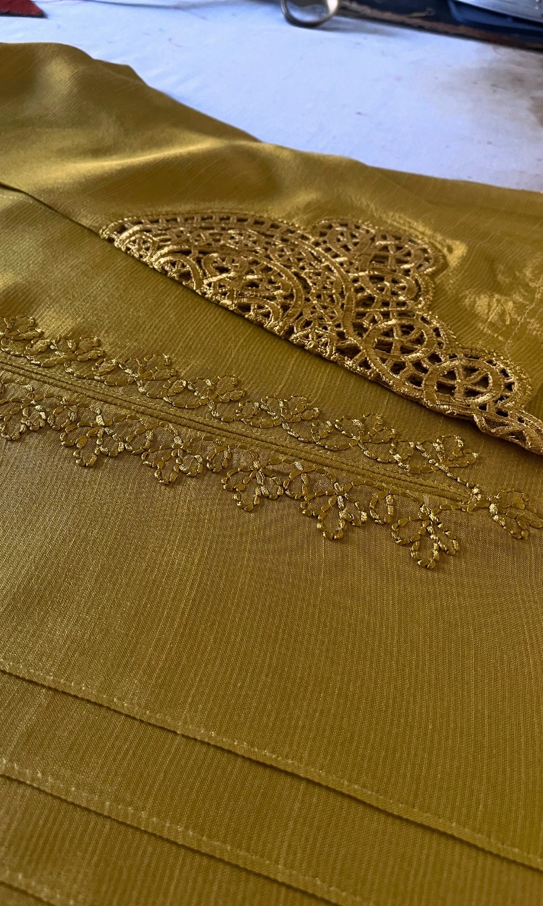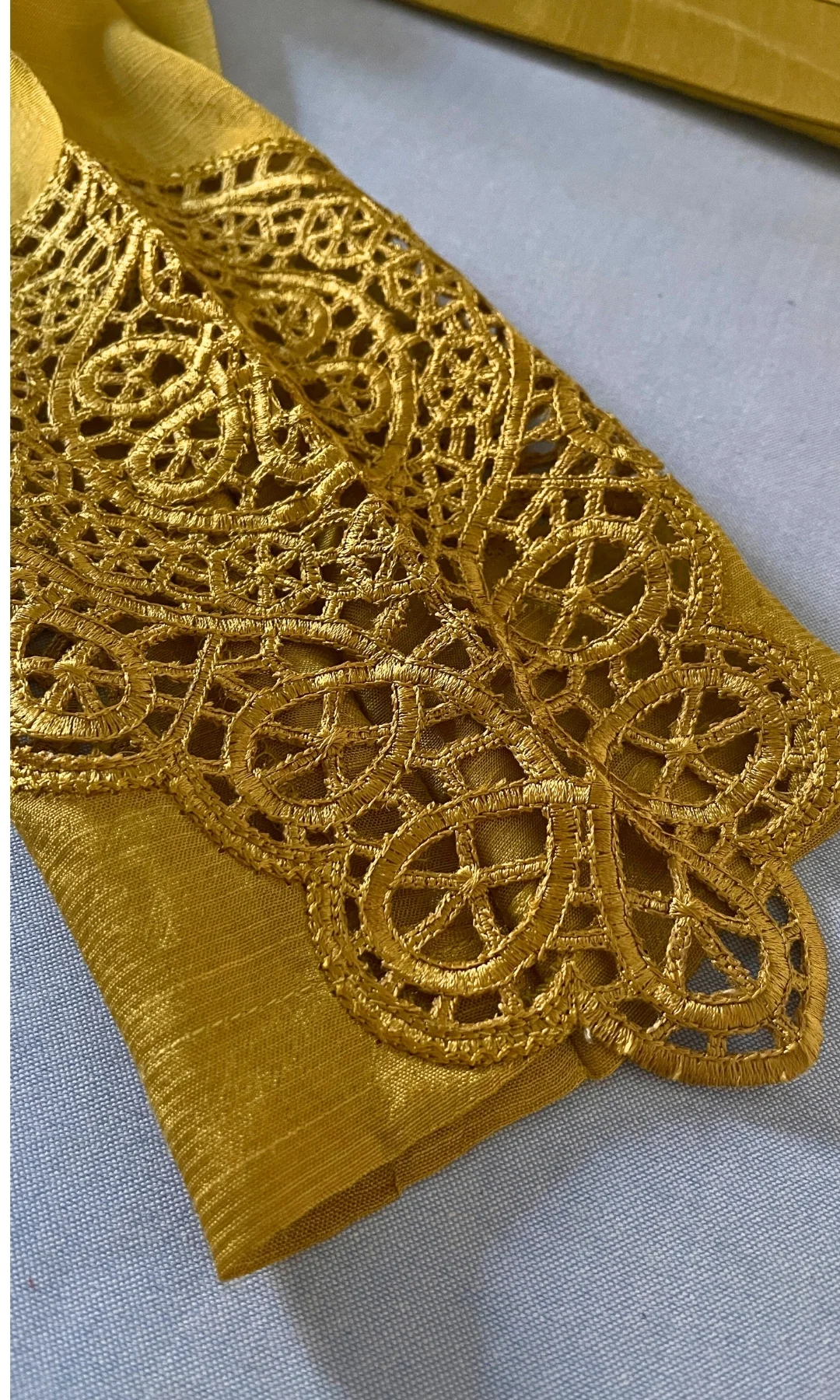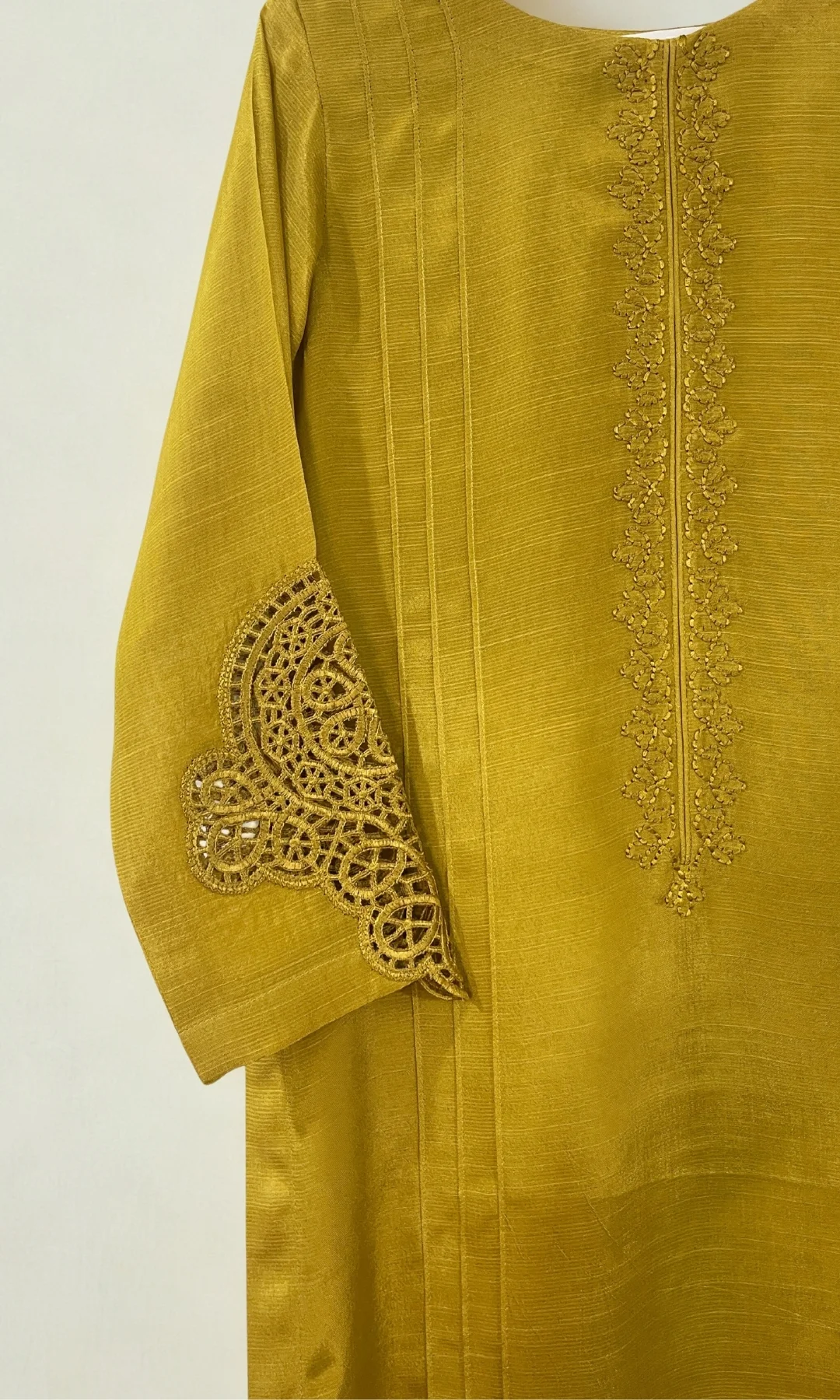 A regular-fit raw silk shirt with intricate hand-embroidered neckline work with embroidered cutwork sleeve and pleat lace detailing.