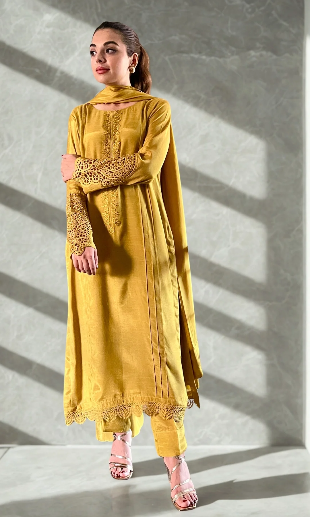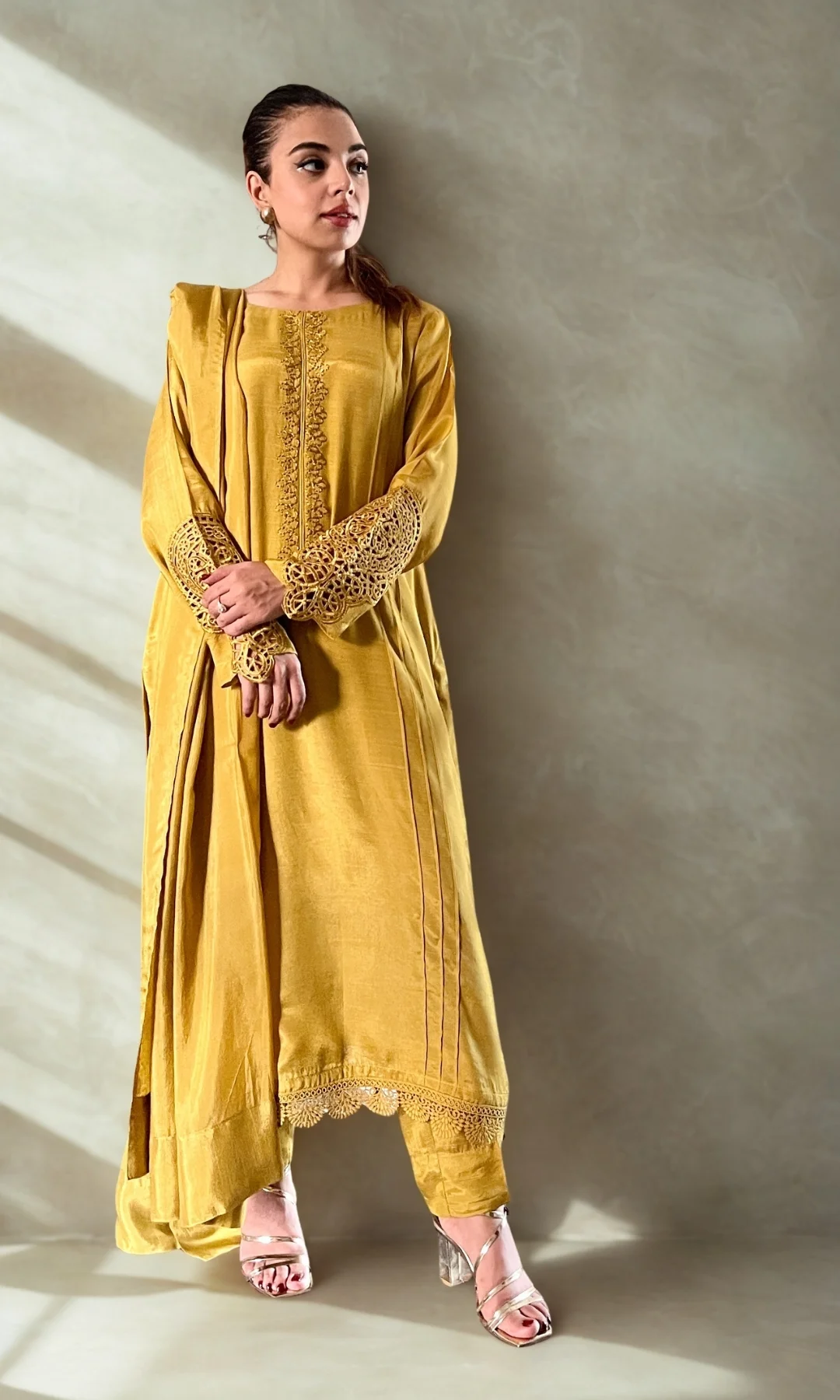 Paired with Raw silk trouser. Dupatta finished with facing on pallu sides.