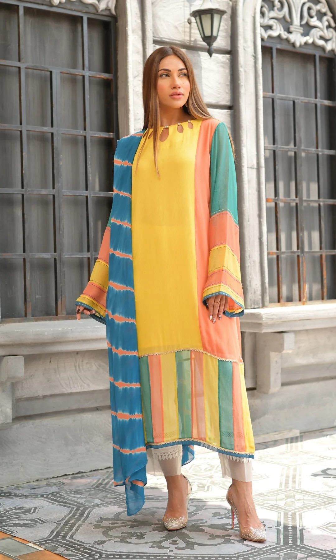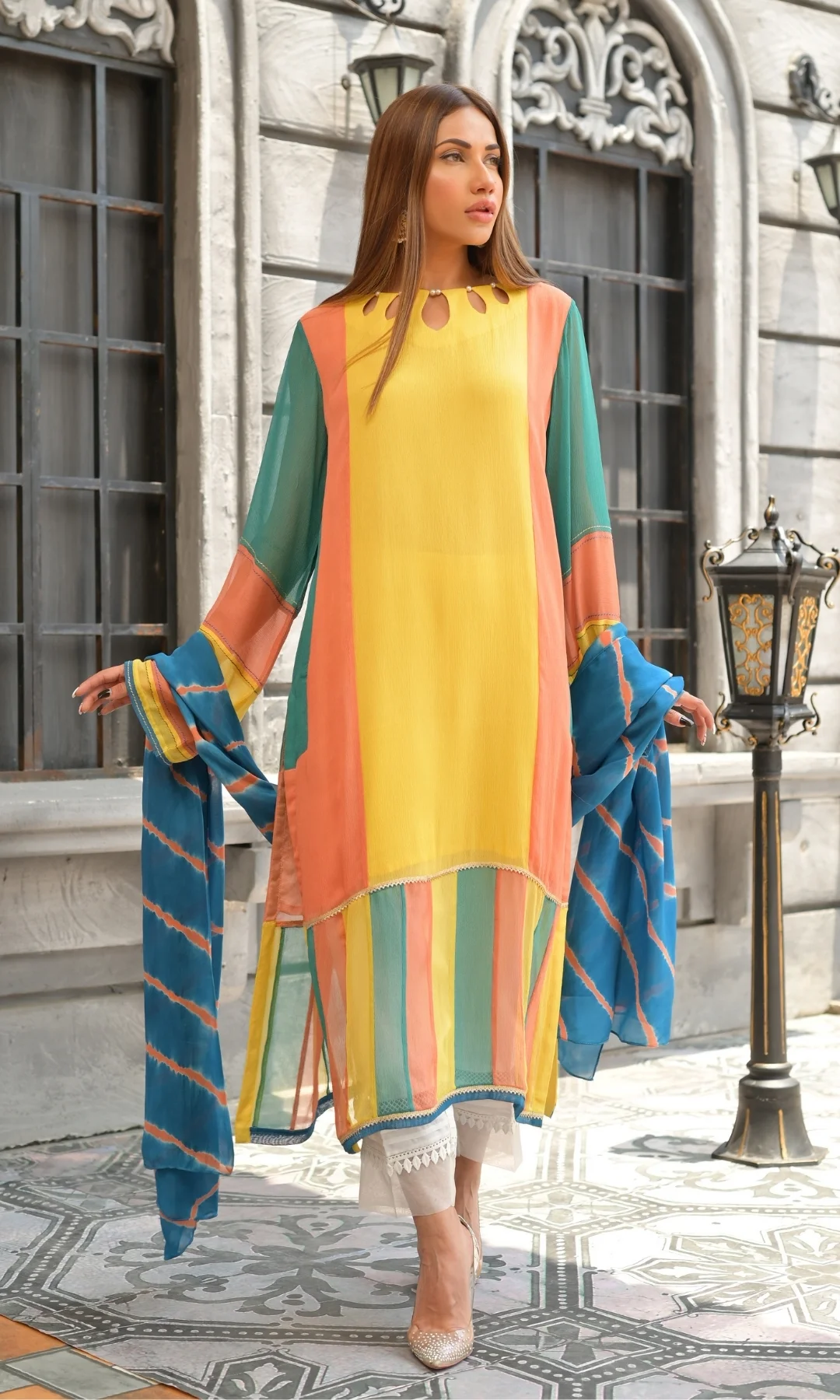 Embrace a fusion of tradition and innovation with this lace ensemble adorned with delicate dori work. The sleeves feature a striking screen-printed border inner, creating a vivid contrast with the intricate lace. Stone buttons add a touch of glamour, while the straight pants with lace details ensure a seamless blend of classic charm and contemporary sophistication.