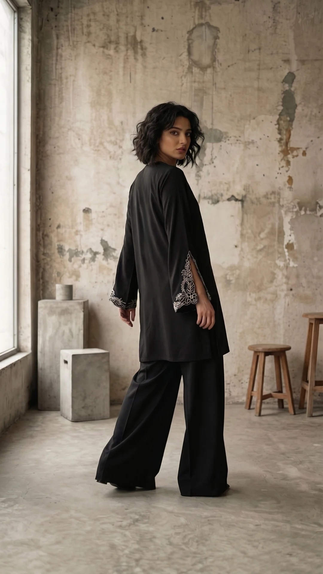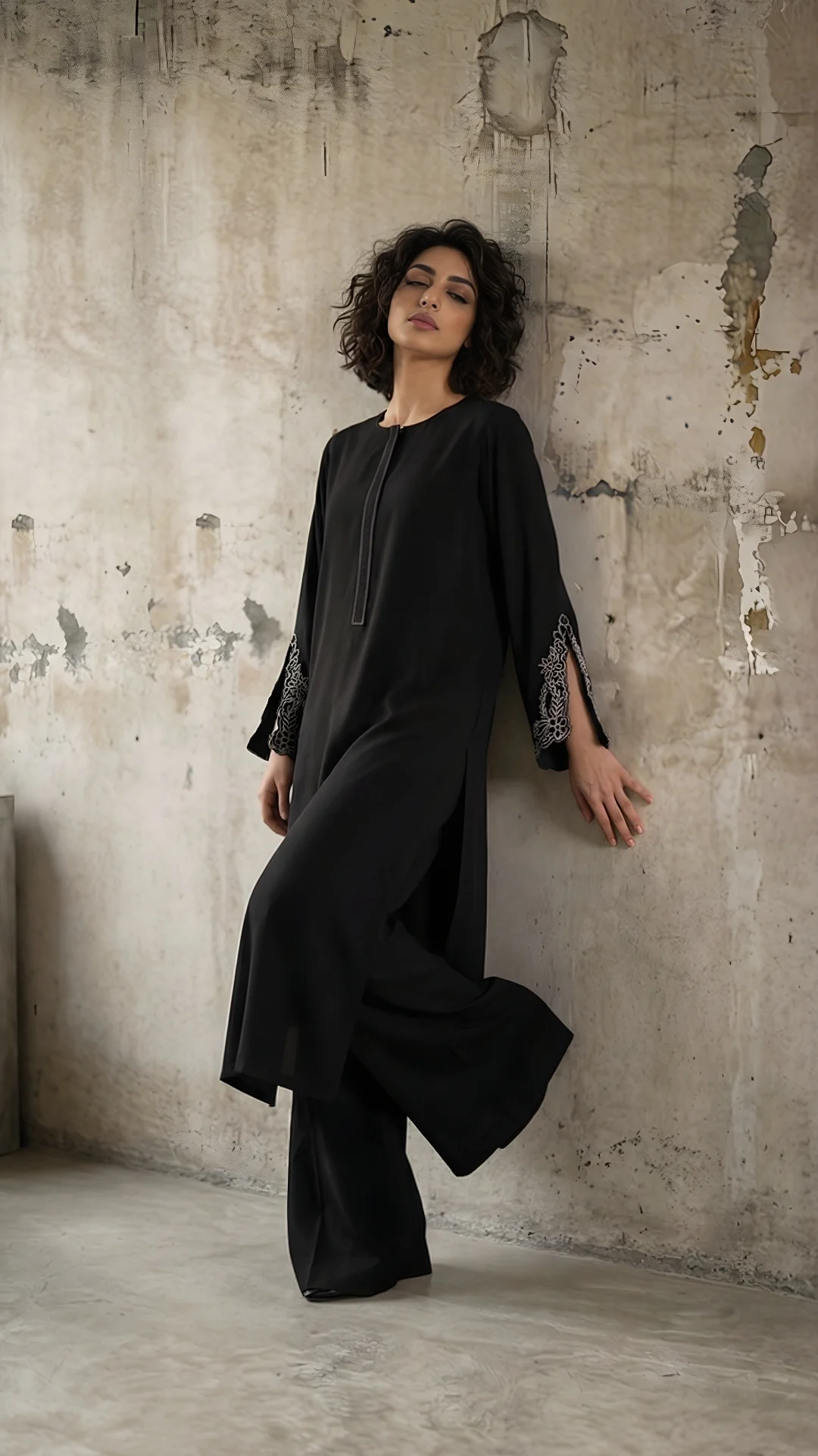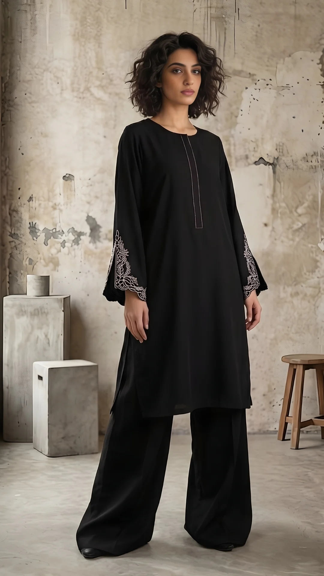 A graceful silhouette that garners attention for its styling. An Italian crepe shirt with delicate structured embroidery with slits. Kaantha details around the placket neckline. Dress up or dress down; just the perfect fit to look ravishing.