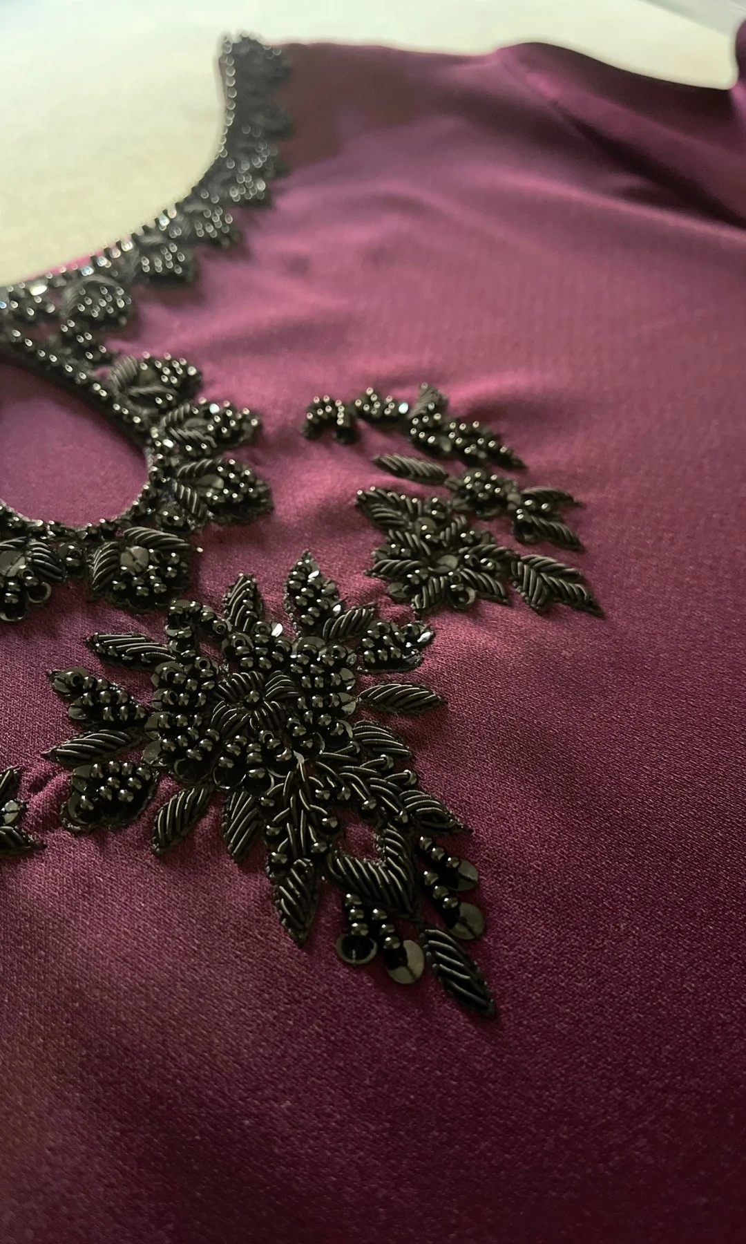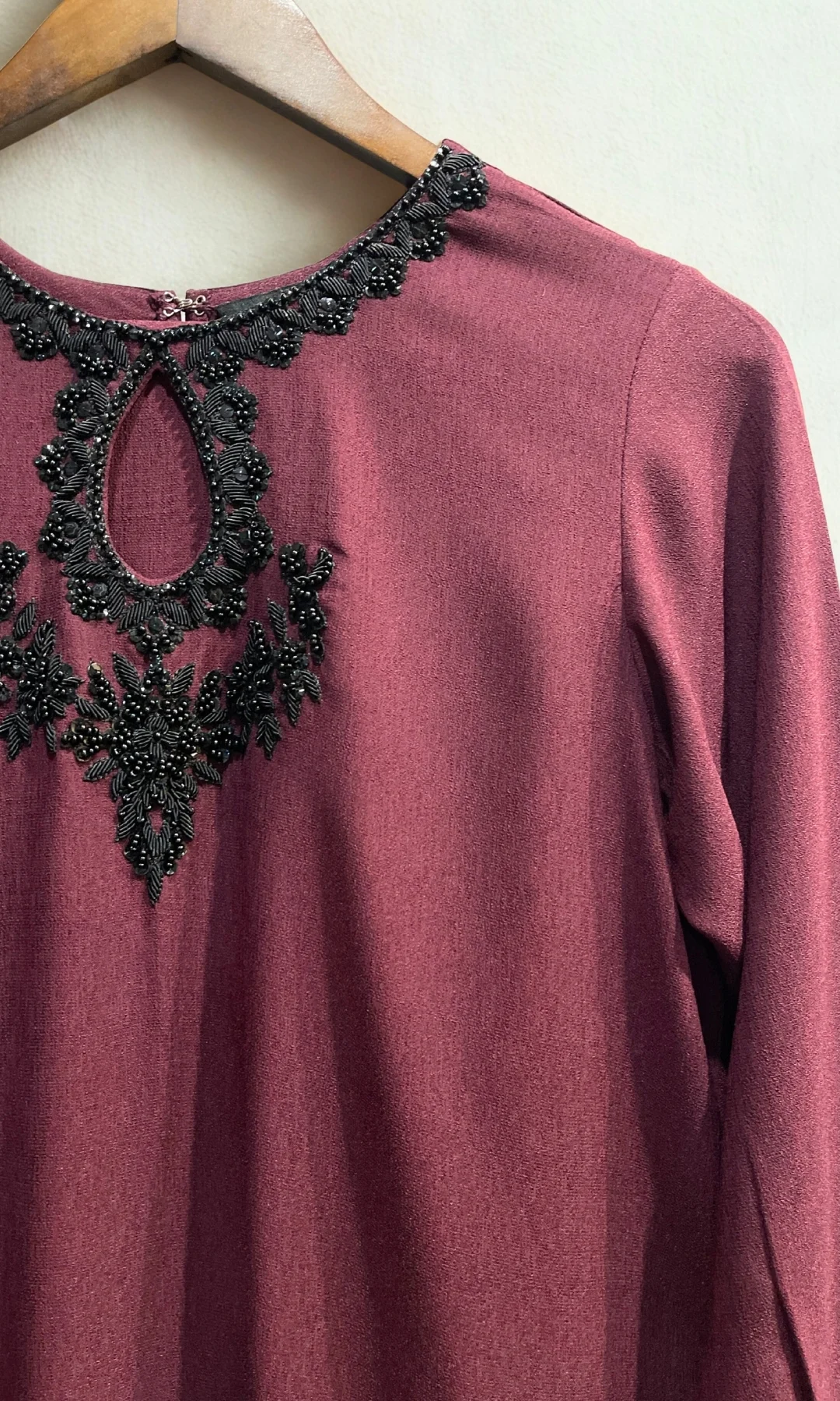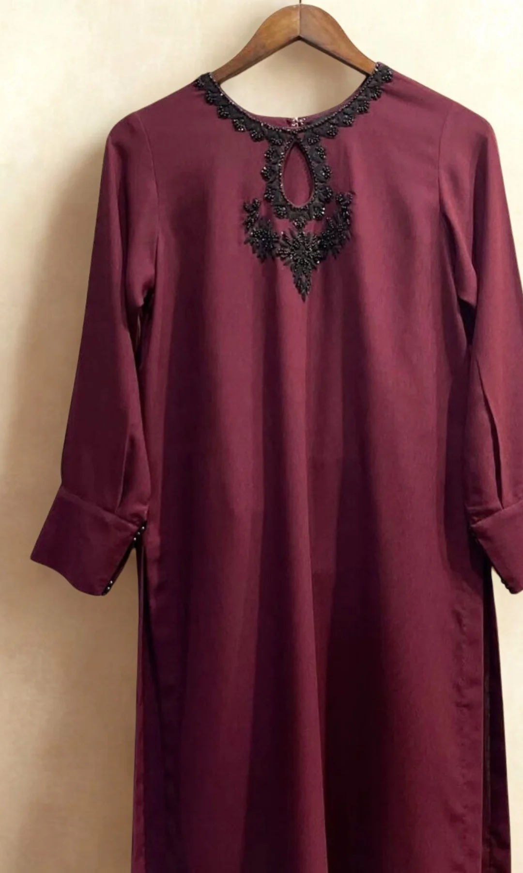 A regular-fit shirt with an intricate hand-embroidered neckline, work with keyhole, and cuffs with pearl detailing around the sleeve.