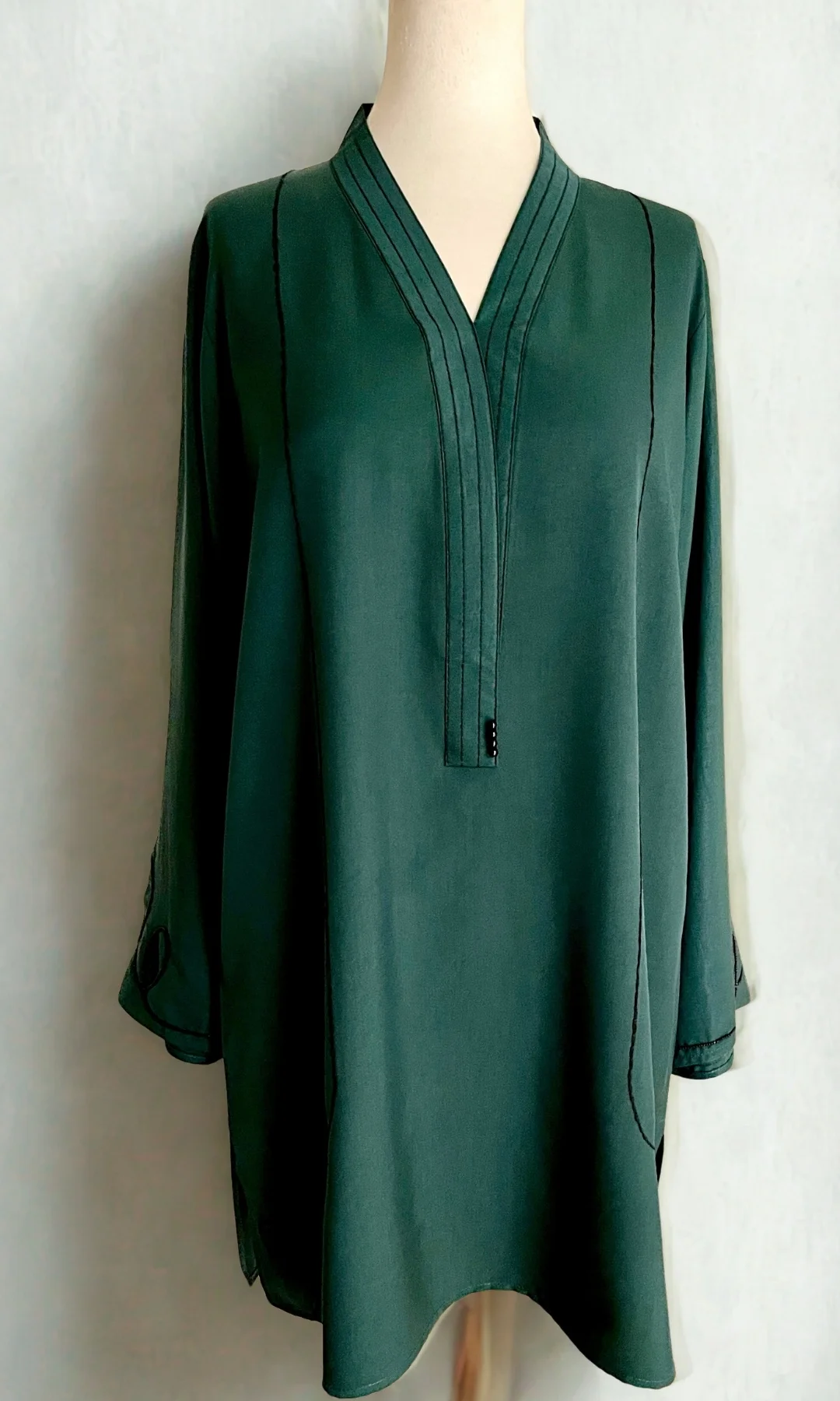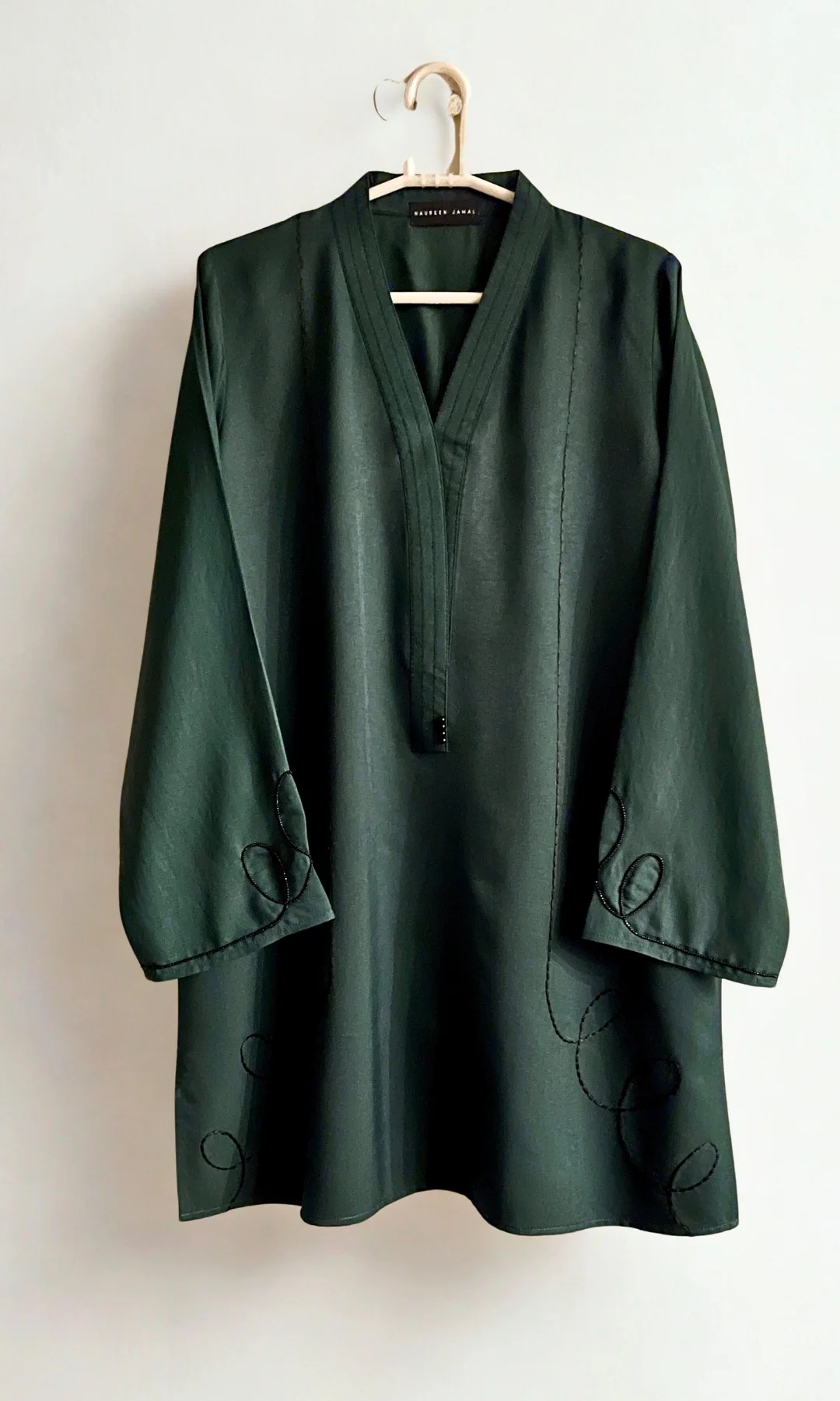 This emerald green shirt features pearl embroidery in black with stitching details alongside the neckline and sleeve ends. Paired with wide legged Trouser.
