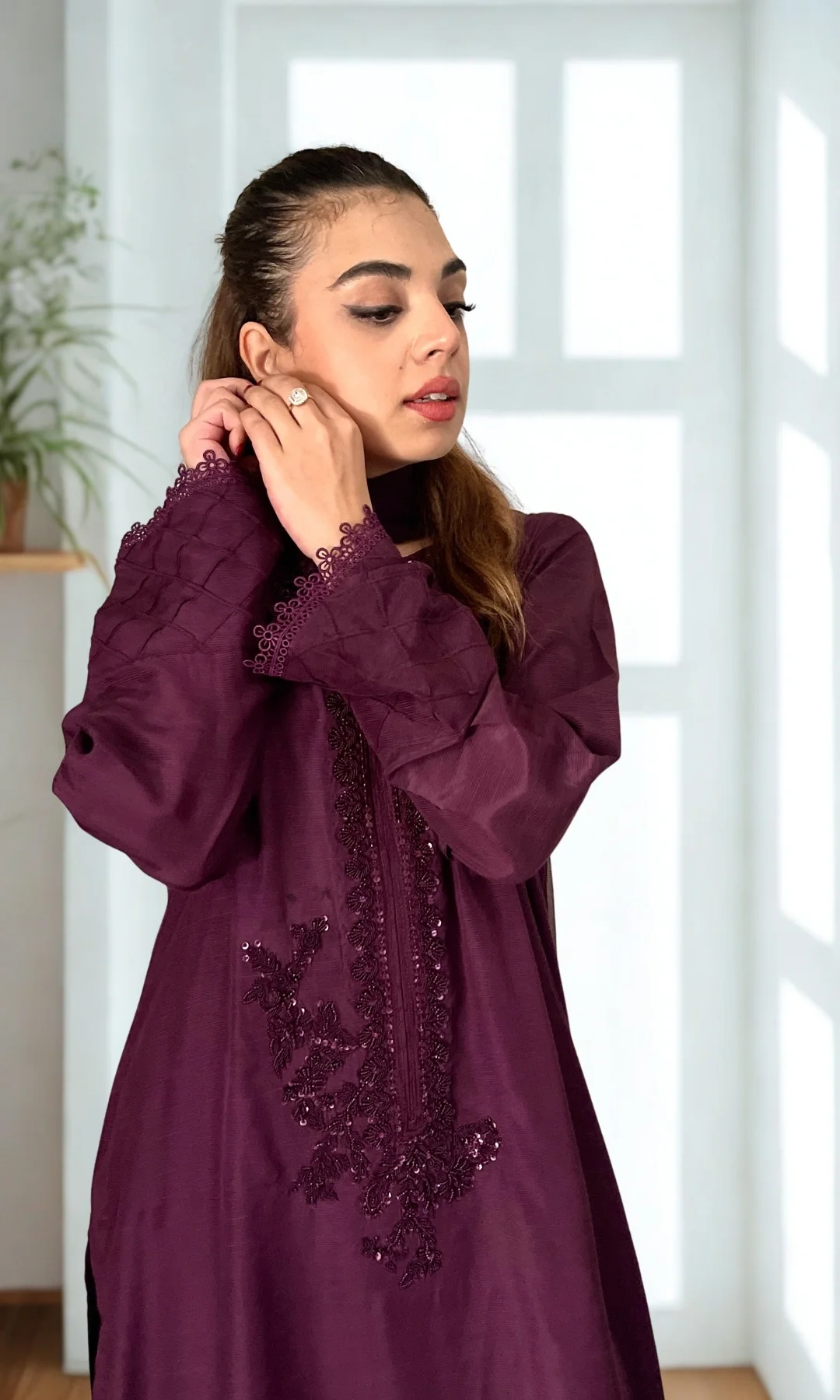 A regular fit raw silk shirt with hand embroidered zardozi work in kora dabka nakshi and sitara. Pleat and lace details in sleeve.