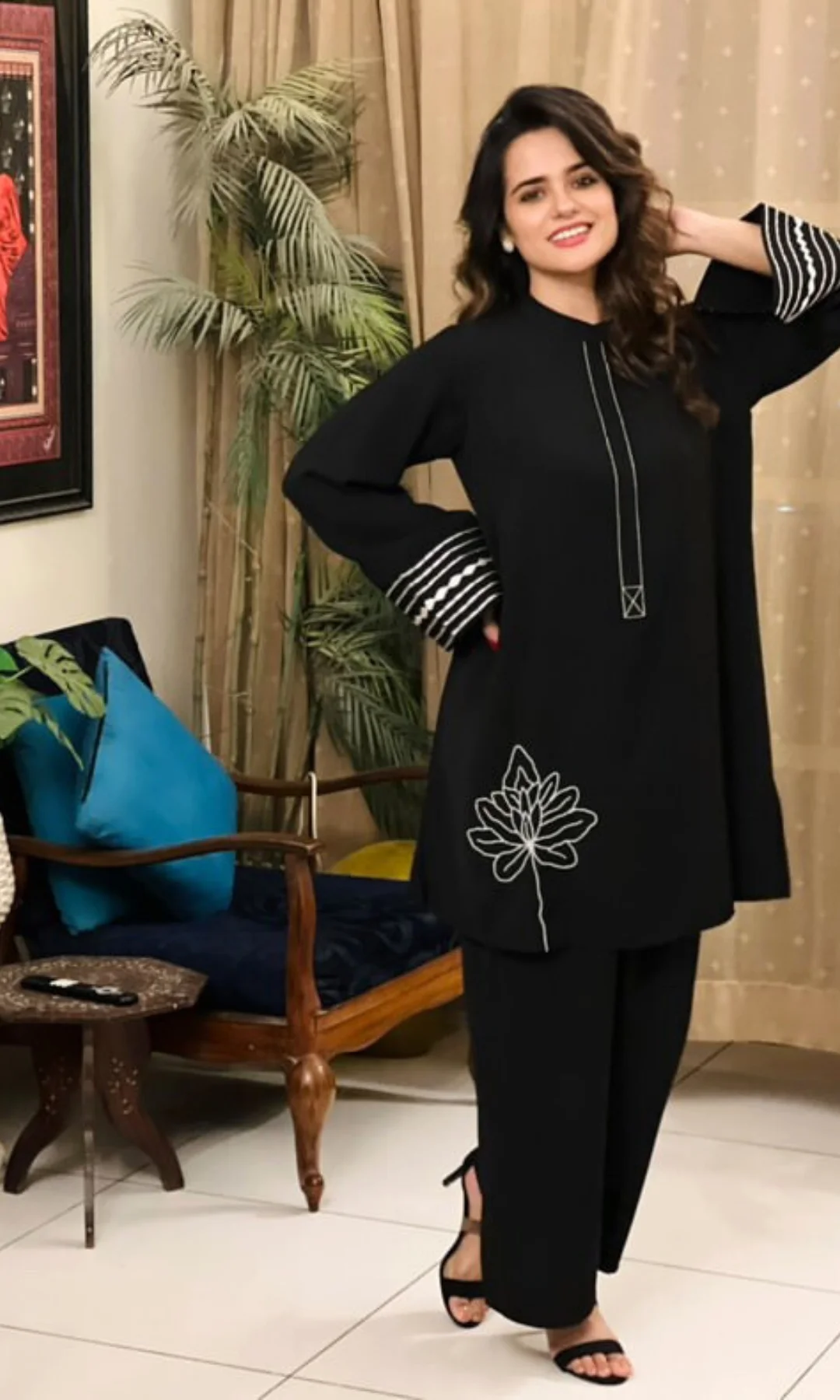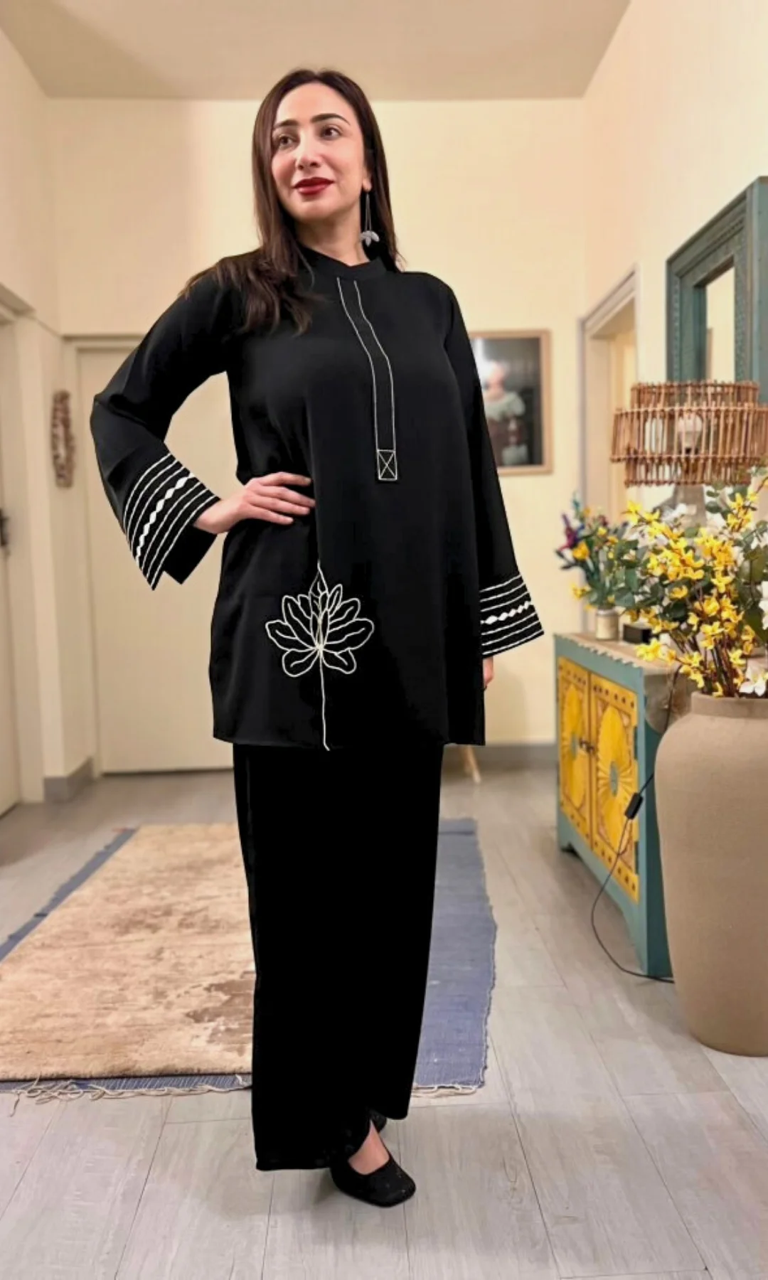 A short shirt with hand-embroidered floral embroidery in pearl work and taanka work in sleeves, wrinkle-resistant and fluid fall.