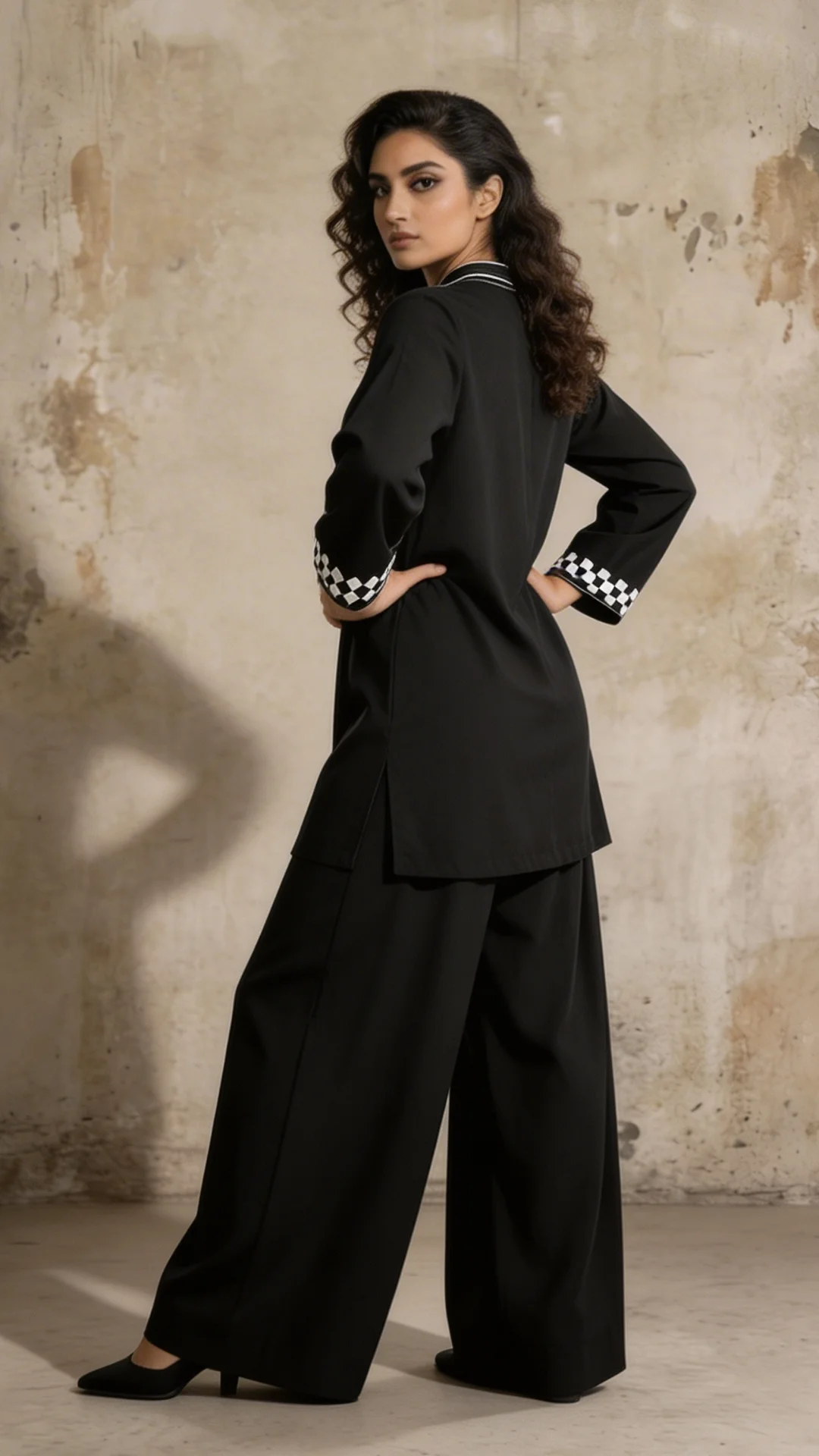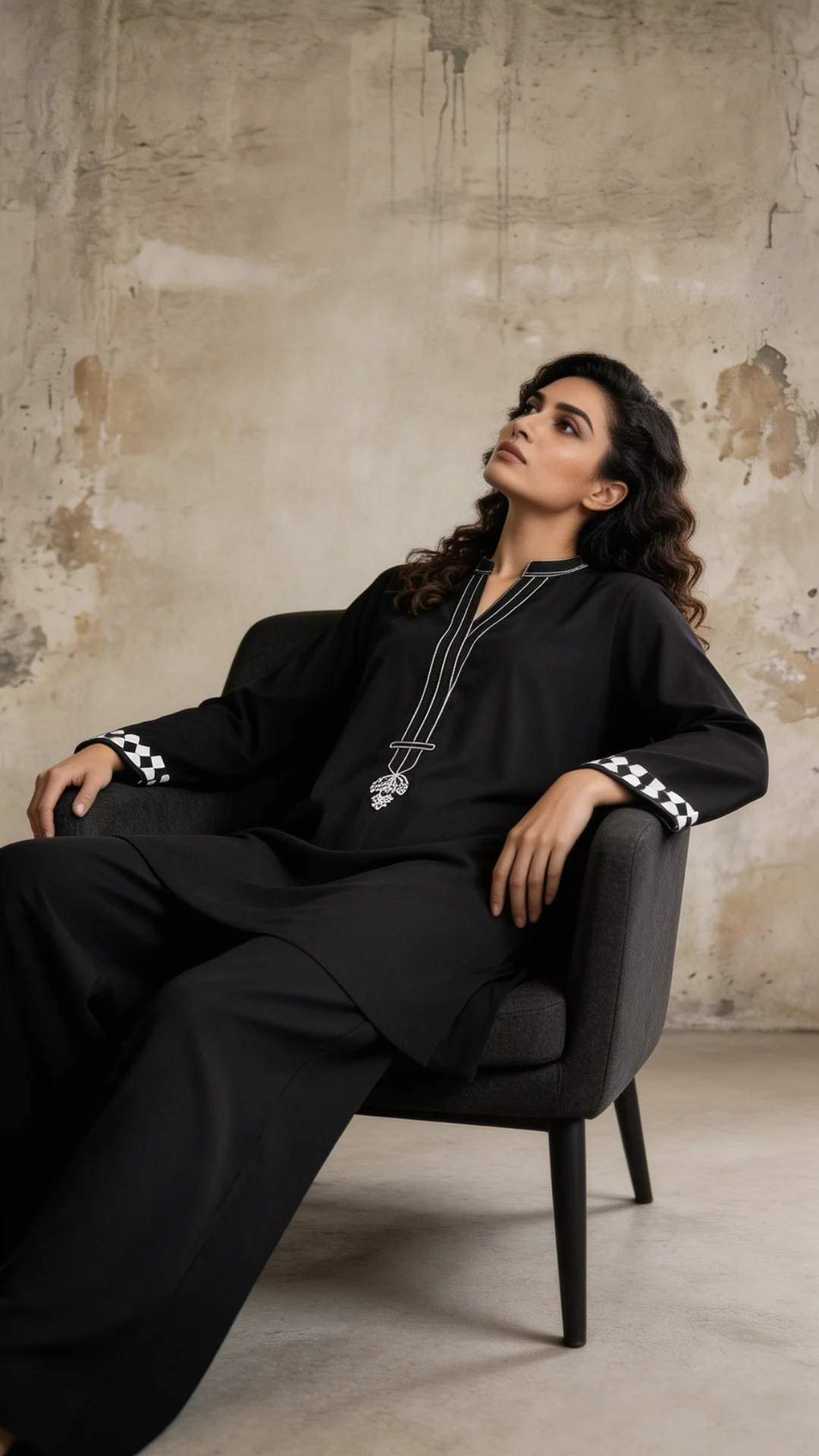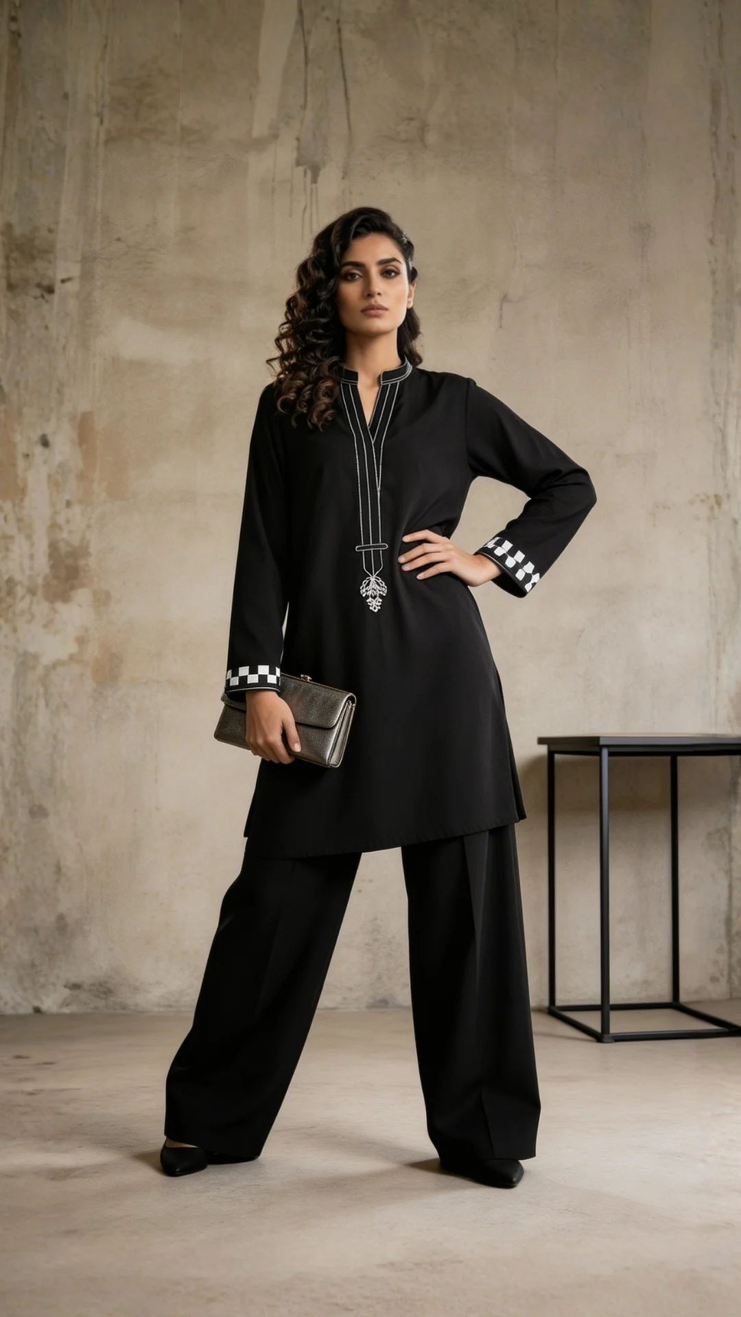 A chic outfit with aari embroidery along the neckline and sleeve ends. The stitching details add a soft touch while culottes keep it relaxed; a complete day-to-night outfit.