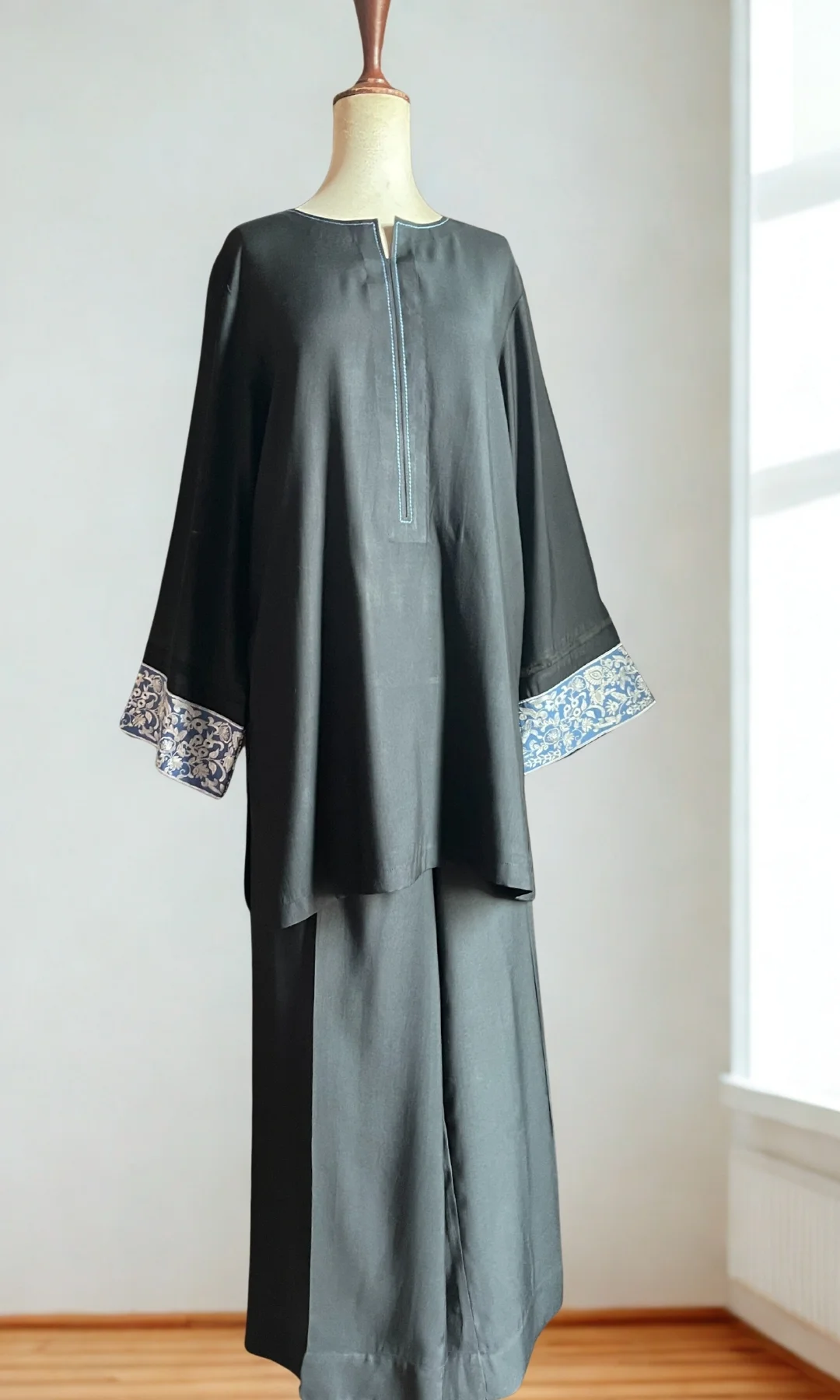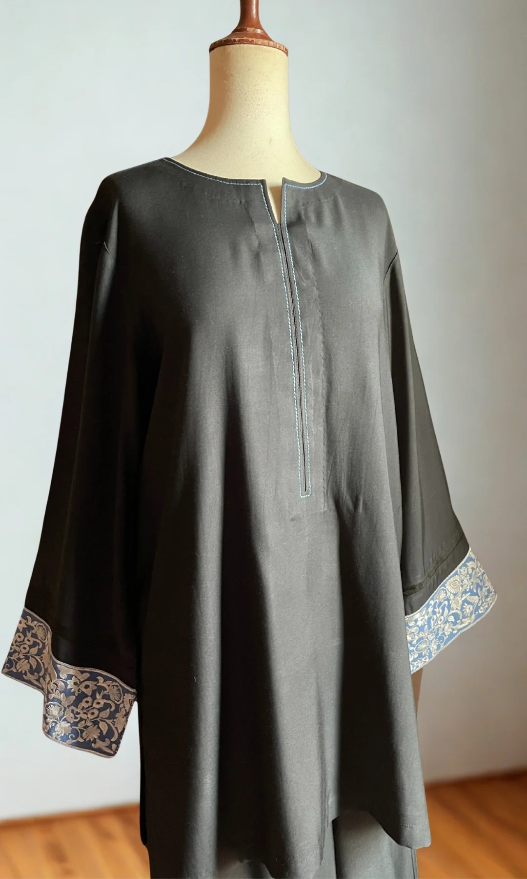 This is a modern interpretation of elegance. Embroidered border on the hem of sleeves, along with stitching details around the neckline complete the look.