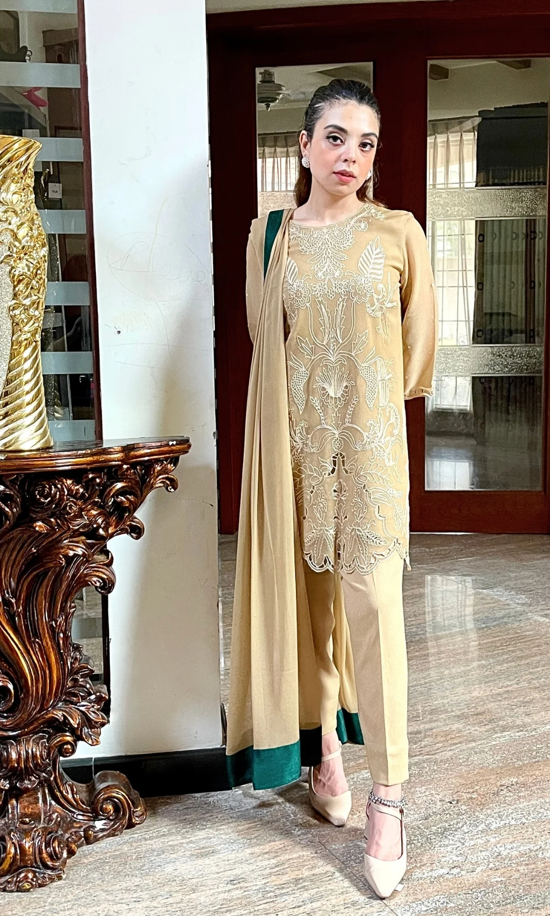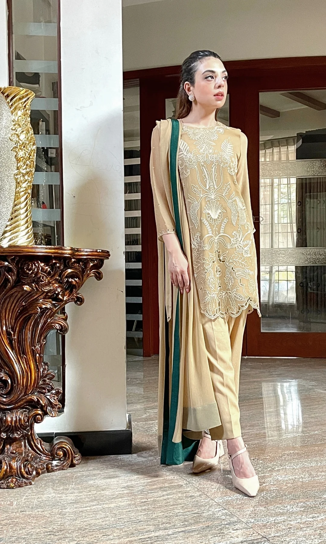 Paired with plain trousers. Chiffon or silk dupatta with contrasting edging on four sides.