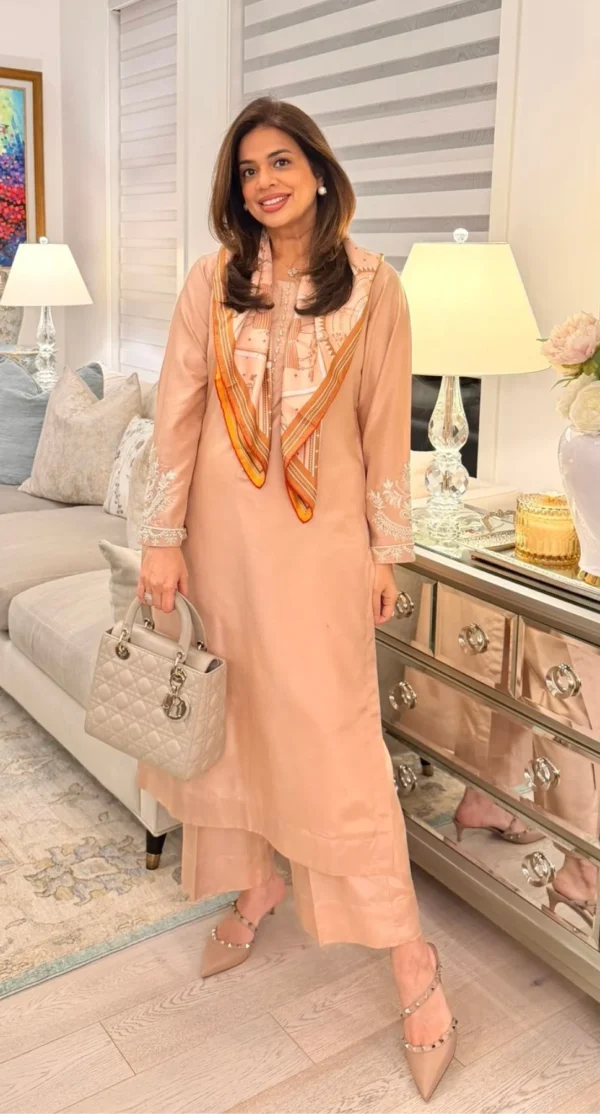 This short shirt features intricate handworked Aari embroidery, cutwork in dull gold with resham and pleat lace detailing .The neckline stands out with handmade buttons and a classi,c clean look. Complimented well with the trending Farshi shalwar. Chiffon or Silk dupatta to pair with.