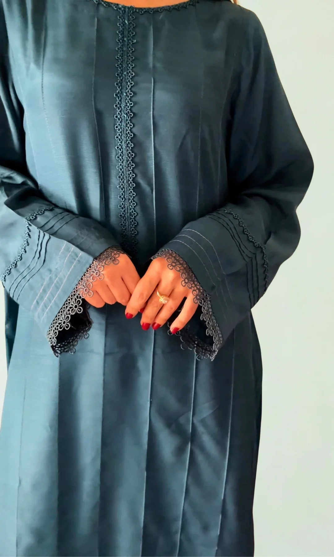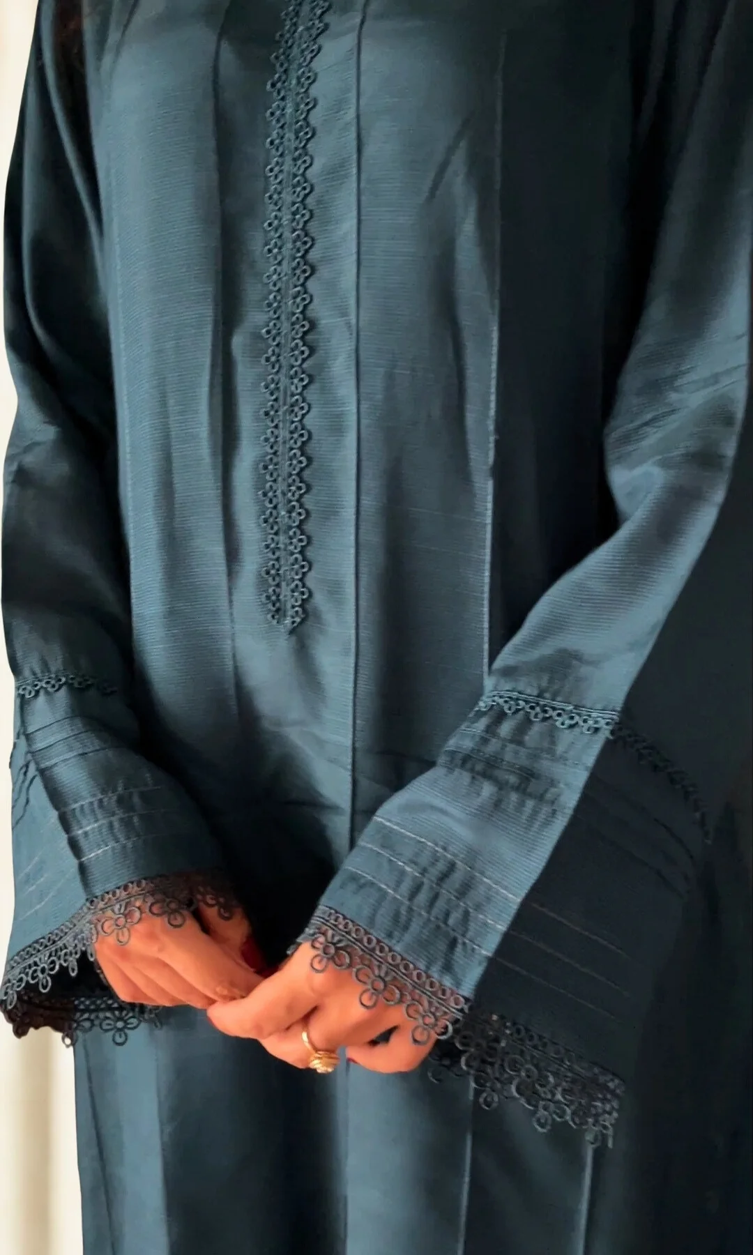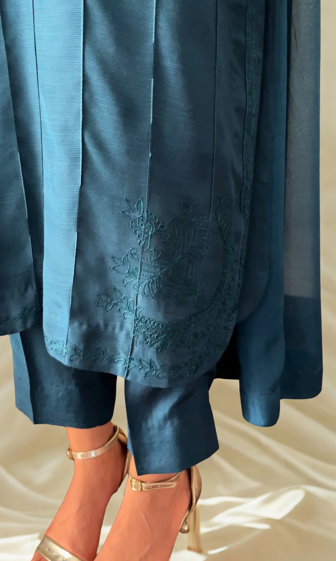 A flowy, regular-fit raw silk shirt with hand-embroidered aari work on daman. Pintec and lace details on the shirt. Paired with plain, raw silk trousers