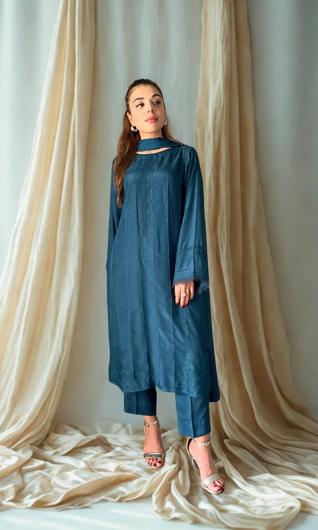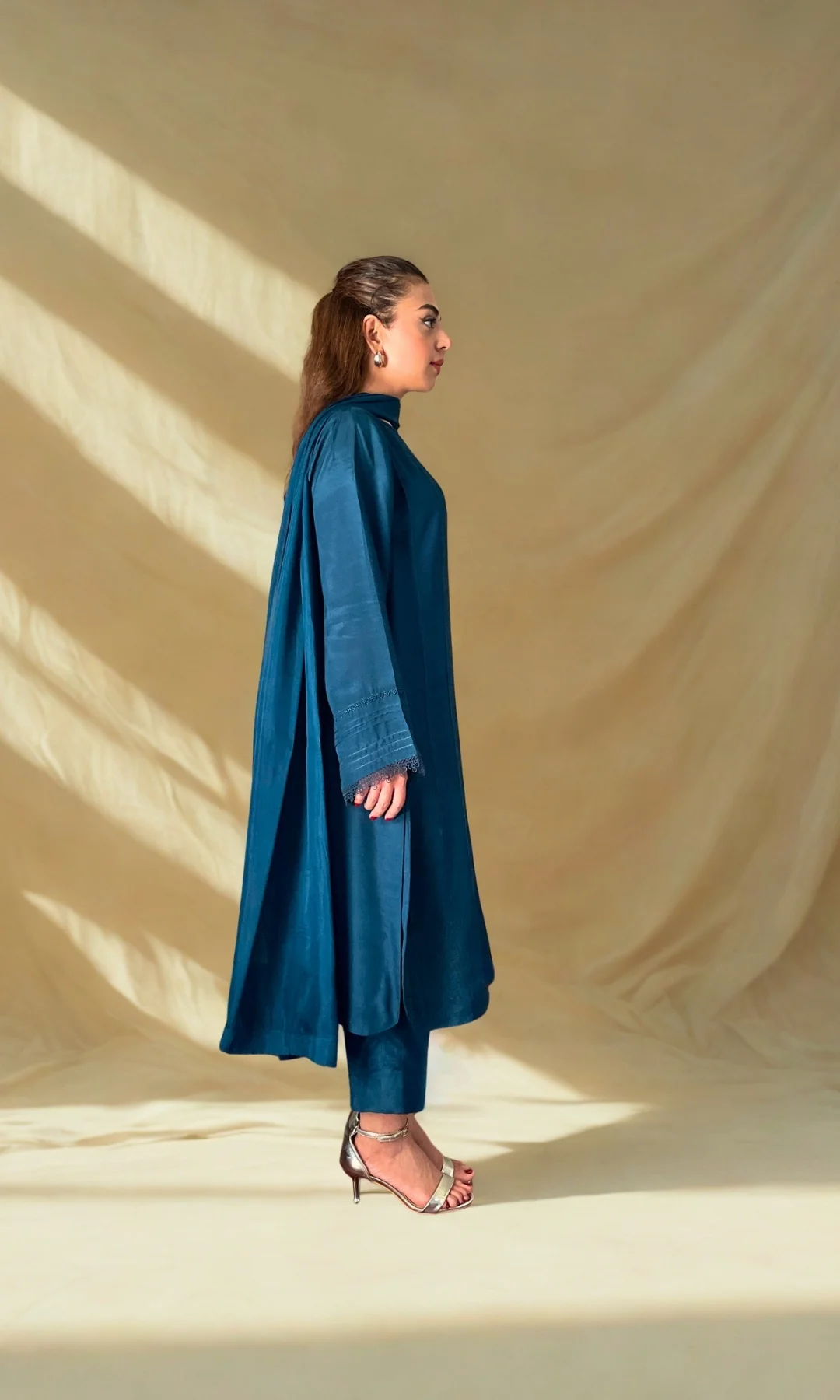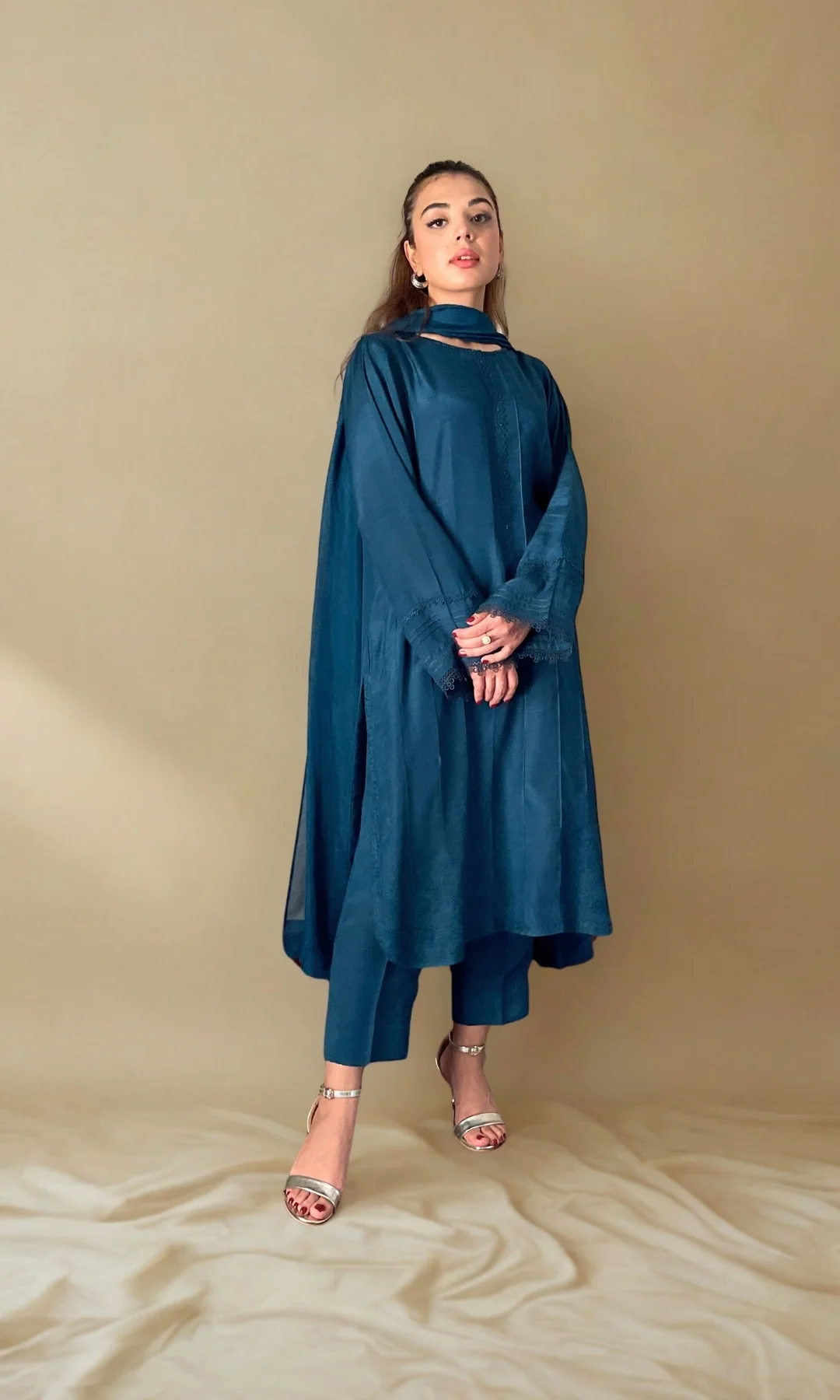 A flowy, regular-fit raw silk shirt with hand-embroidered aari work on daman. Pintec and lace details on the shirt. Paired with plain, raw silk trousers
