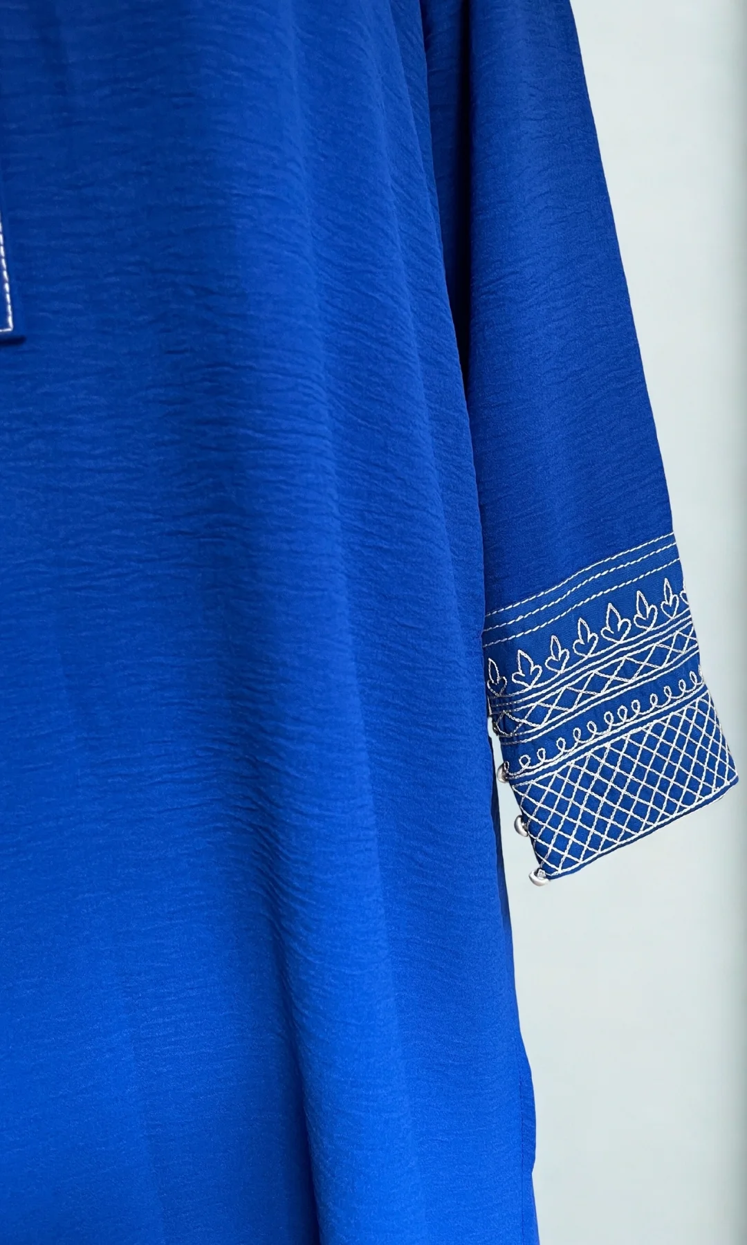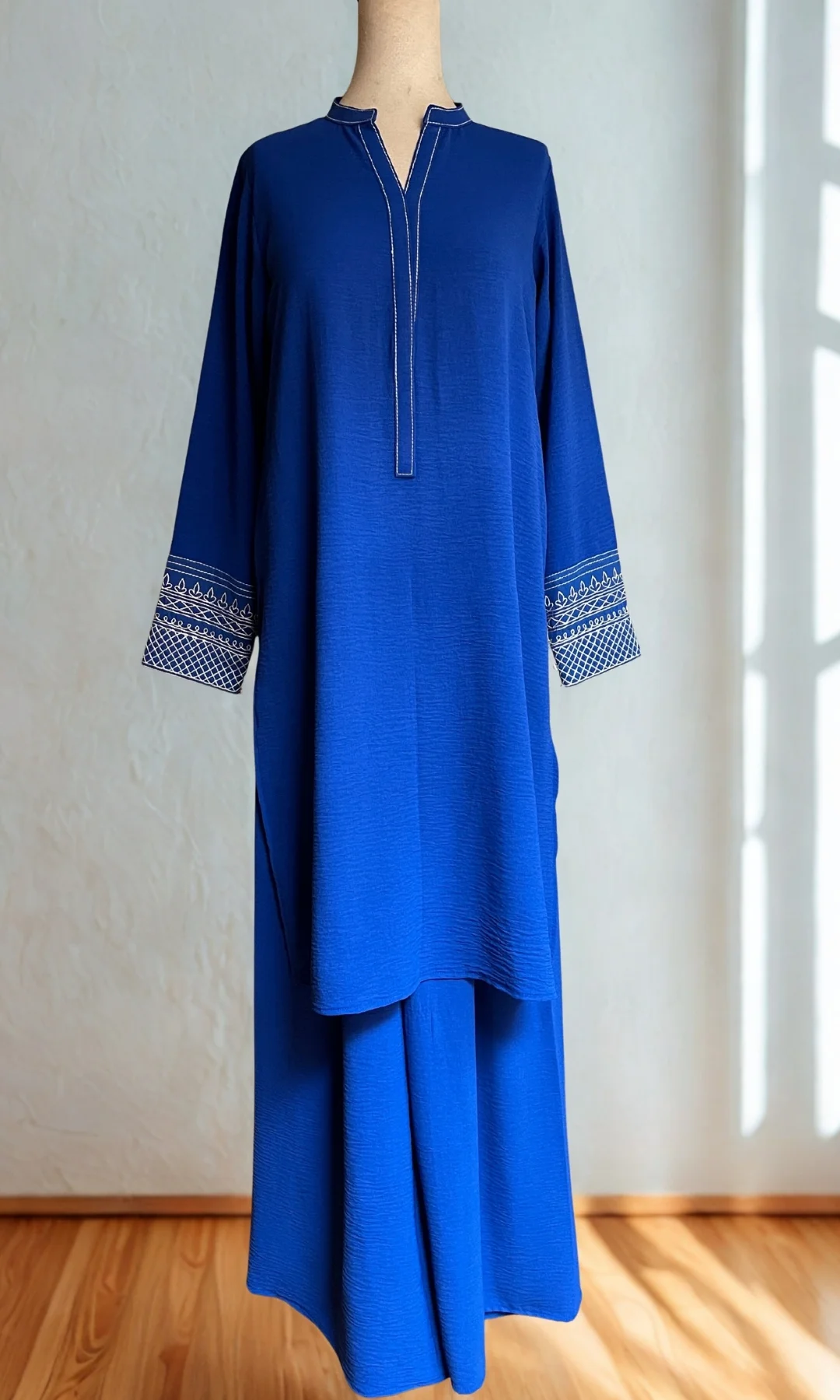 Step into winter with this premium crepe two-piece outfit. The kurta features elegant hand-done embroidery on wide cuffs with show buttons. The stitching details enhance the overall look of the outfit. Paired with wide legged trouser.