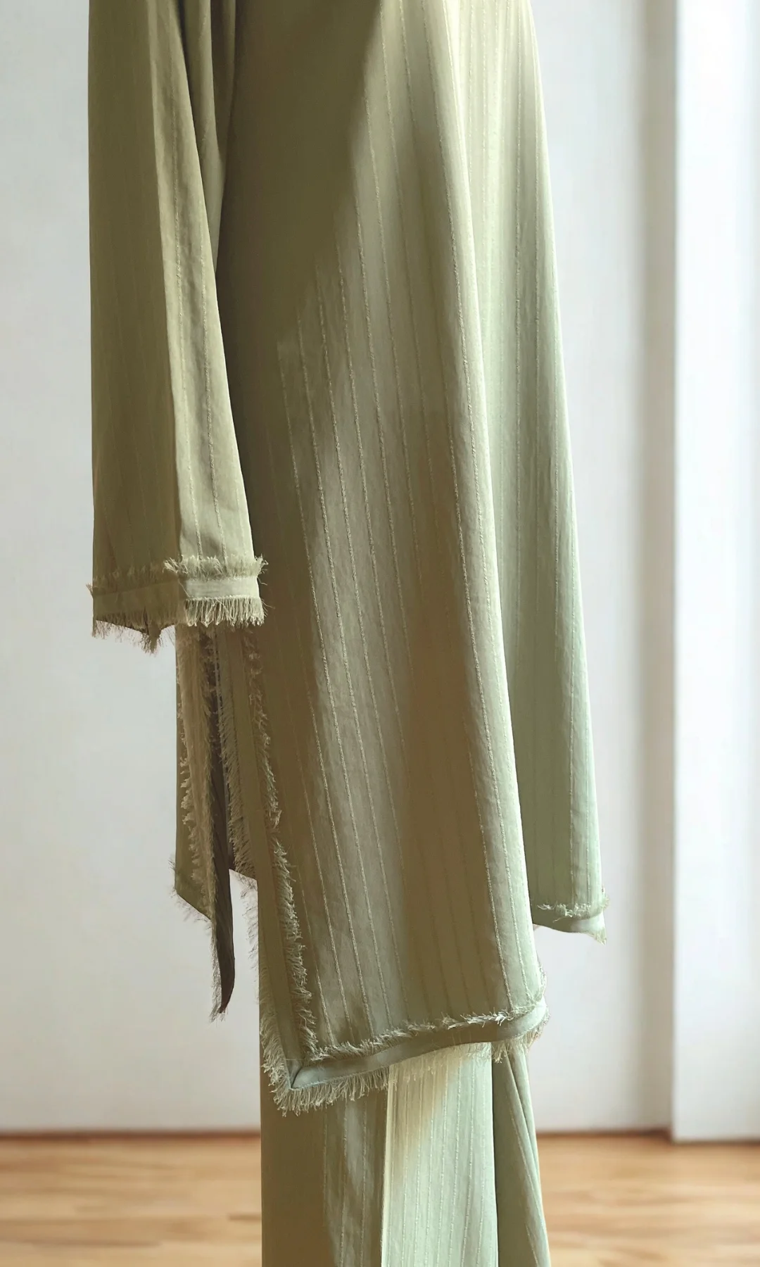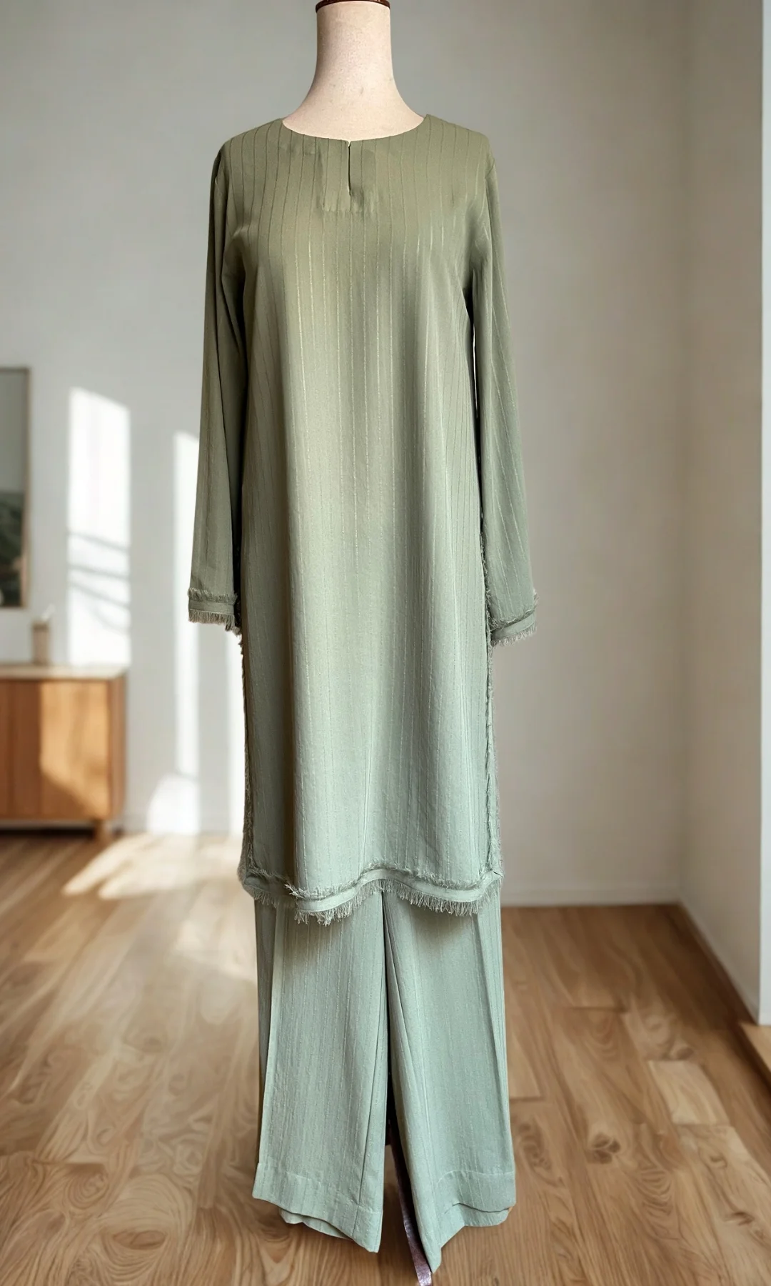 The plain but luxe feel outfit with frey details on the hem and chalks gives away that Eid feeling for a complete and refined style. Elevate your look with this outfit right away.
